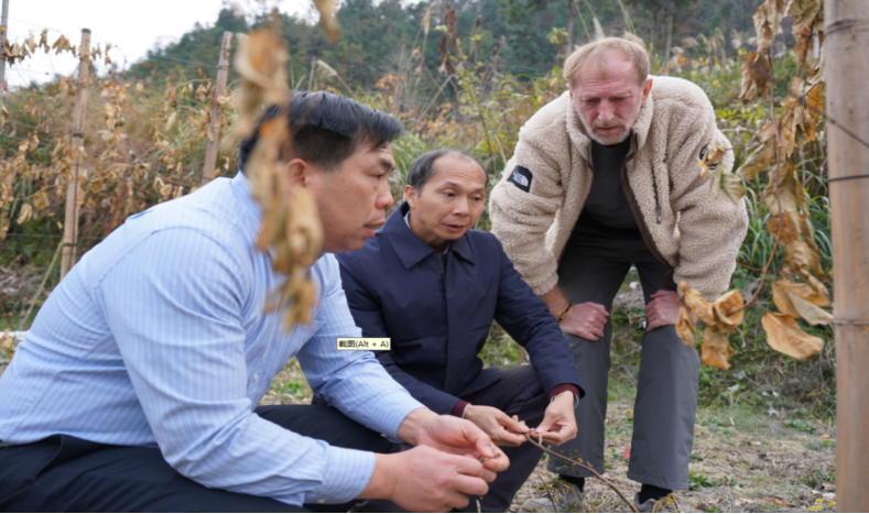 谢万举(左)、唐小付(中)和Nick(右)到百香果地查看果苗冻害发生情况