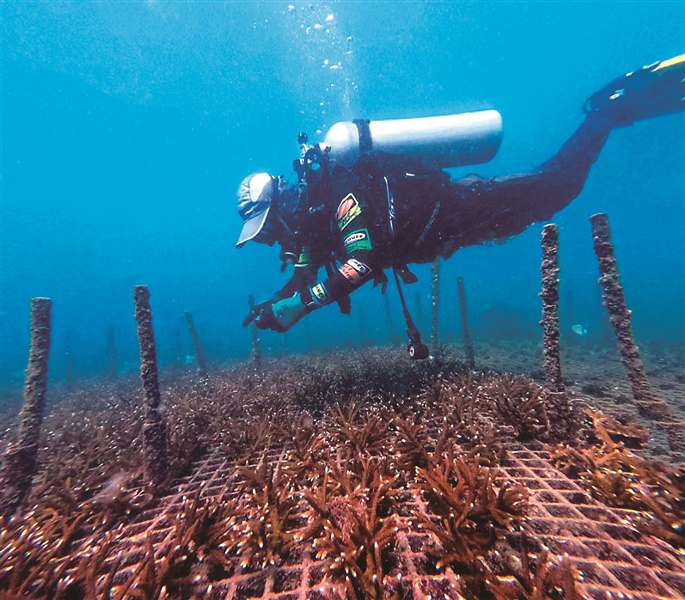 图②: 黄雯博士在海底“种珊瑚”。