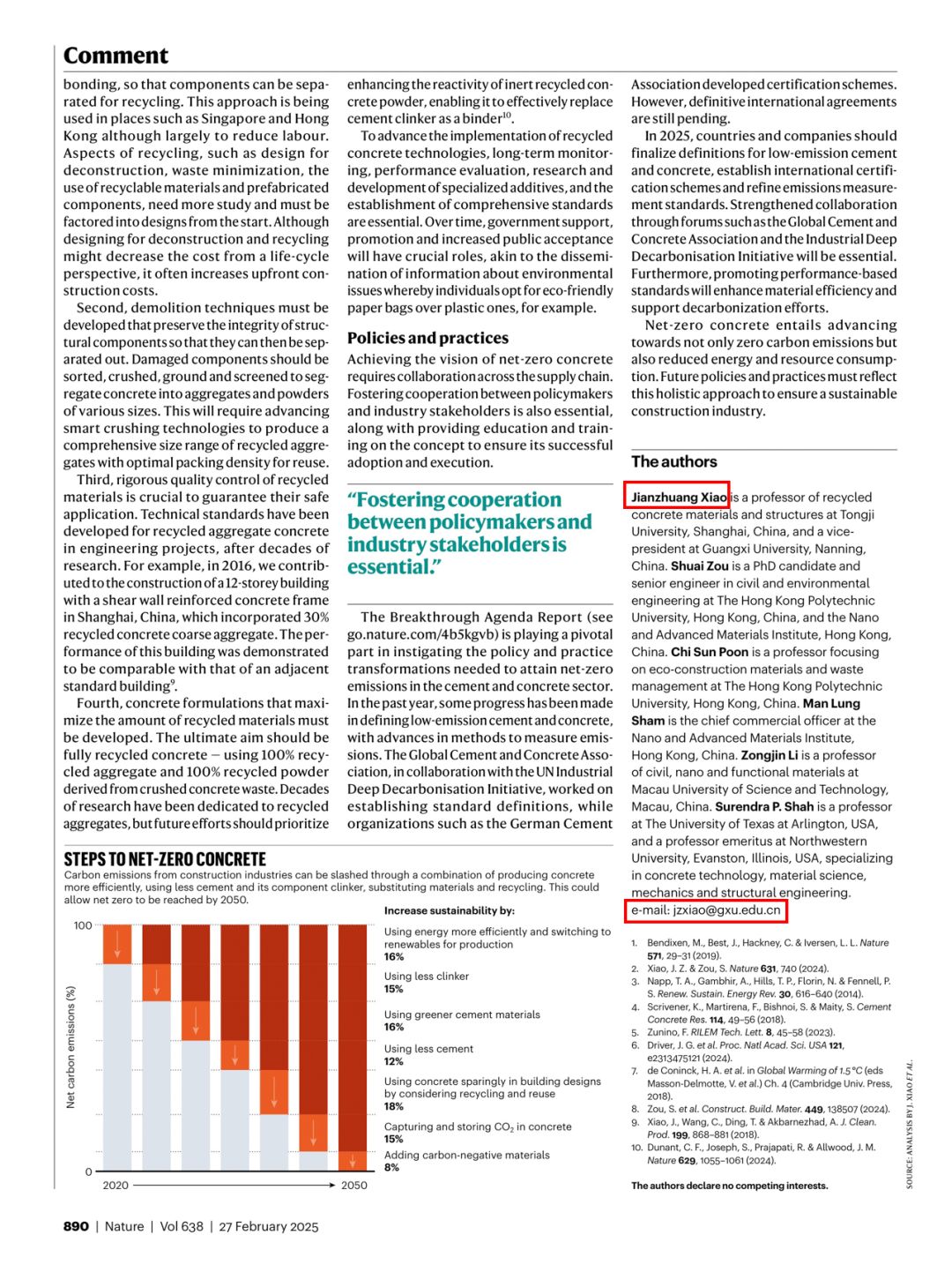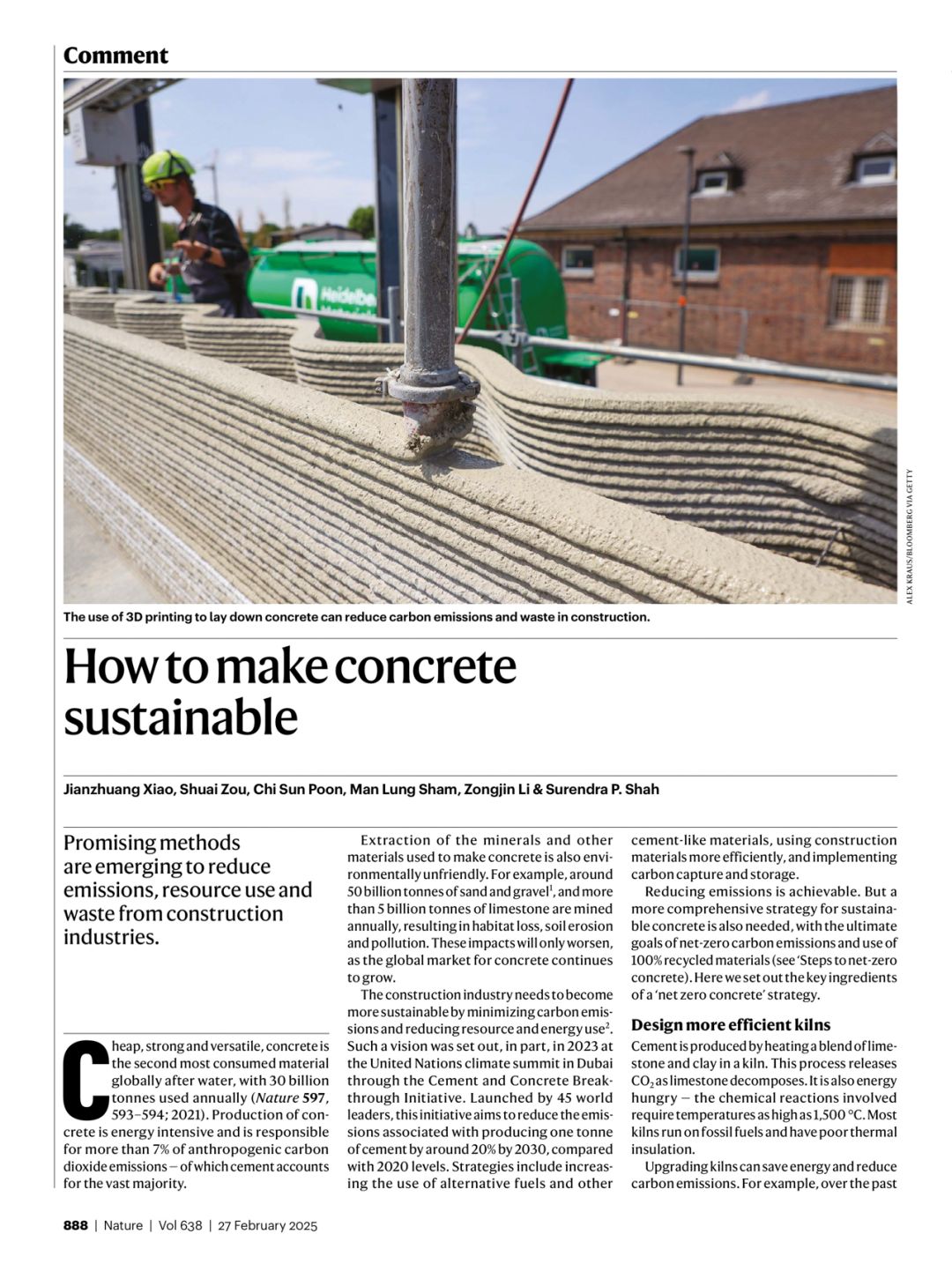 近日,beat365正版唯一官网必一党委常委、副校长,beat365正版唯一官网必一双碳科学与技术研究院院长,同济大学长聘教授肖建庄携手来自不同国家和机构的顶尖学者,以beat365正版唯一官网必一作为通讯单位,在国际顶级学术期刊《Nature》发表评论性文章 “How to make concrete sustainable”,为建筑关键材料的绿色可持续发展提供了清晰的科学依据和技术路线图,引发广泛关注。