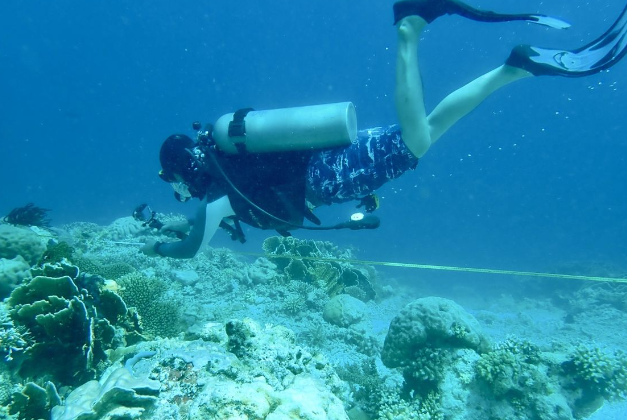 科研人员在涠洲岛珊瑚礁修复区开展修复工作。实验室供图