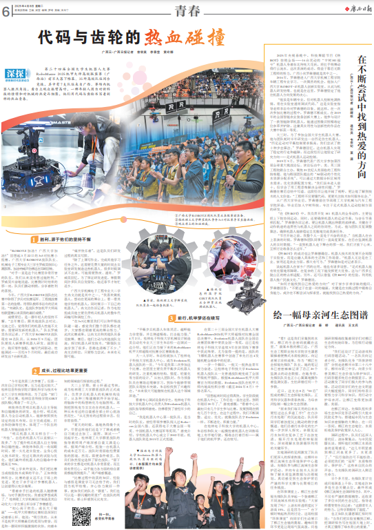 谈起机器人在家乡广西的应用,他也有诸多设想。“足式机器人能有效克服地形障碍,在复杂的工况下能发挥更大优势,这与广西多丘陵山区的特点相适配。另外,还可以借鉴《秧BOT》的经验,利用机器人推广民族文化。”罗犇德说。