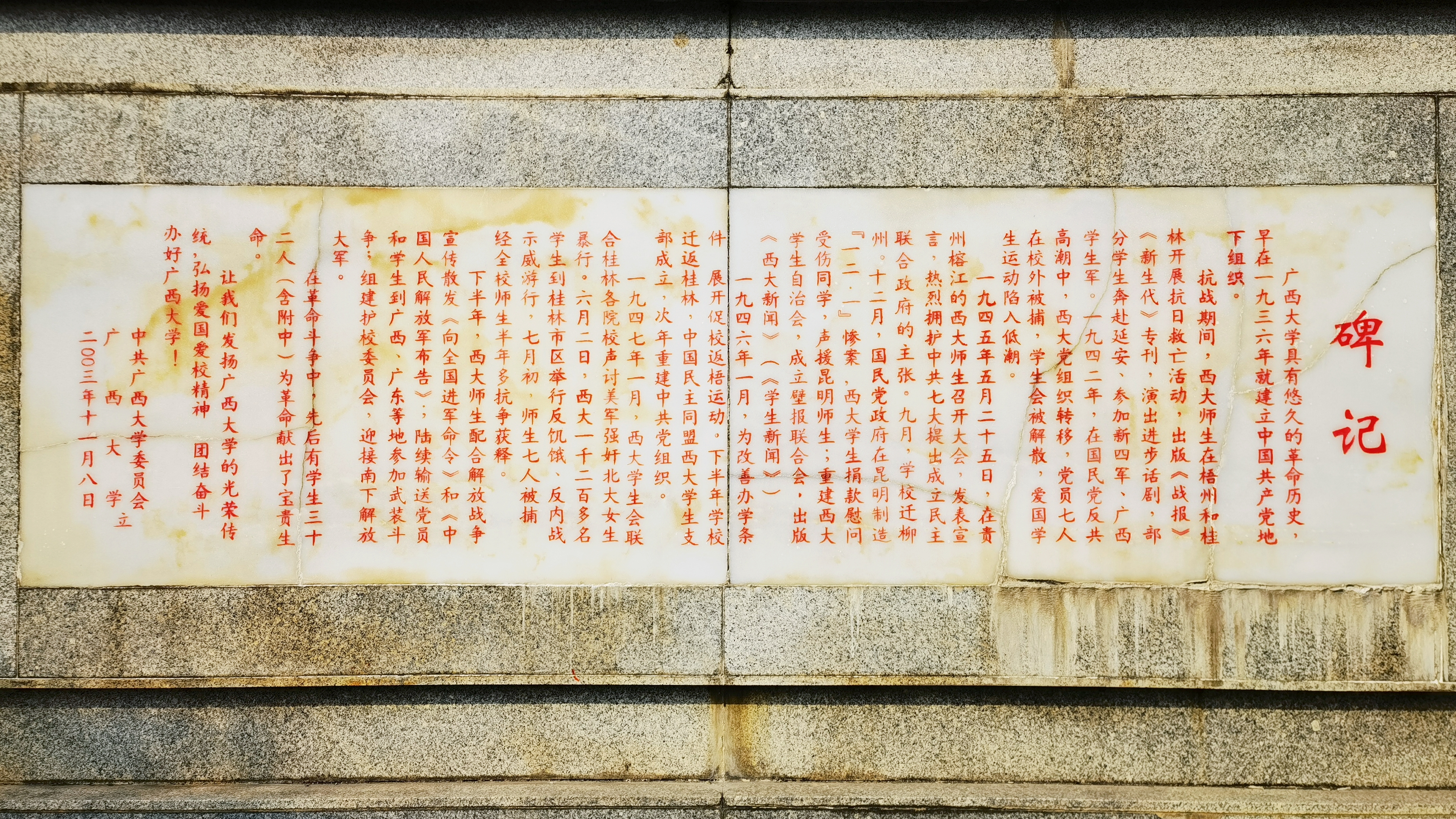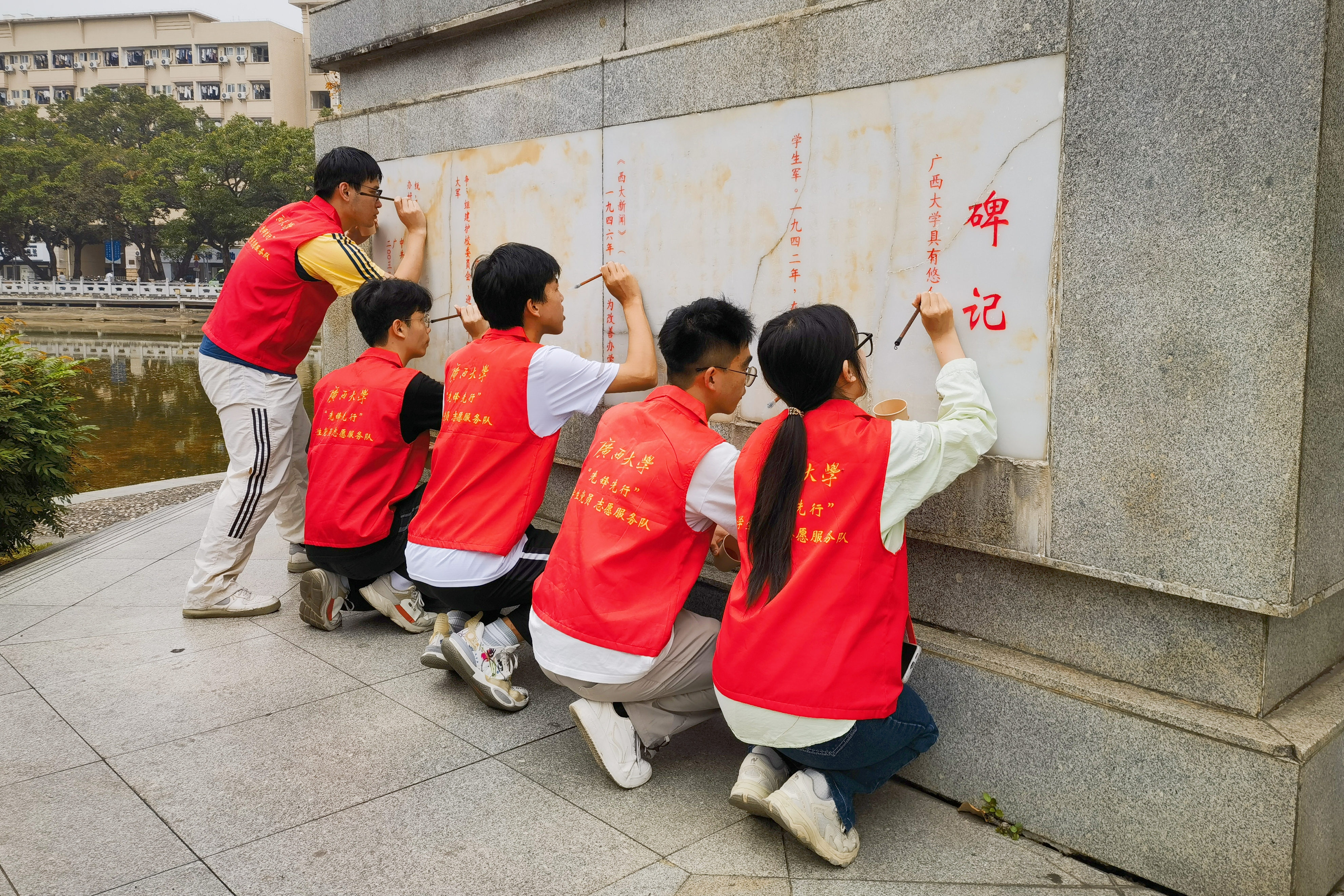 经过时间沉淀和风雨剥蚀,纪念碑的碑文已然褪色。师生们怀着敬仰之情仔细擦拭碑体上的微尘,认真用画笔为碑文描摹填漆。描红一笔,更多一分缅怀;描红一画,更增一分敬意。