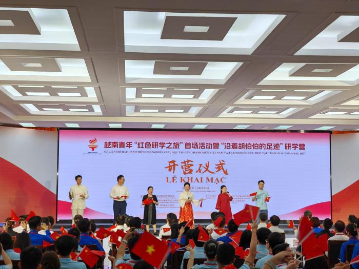 越南青年“红色研学之旅”首场活动暨“沿着胡伯伯的足迹”研学营开营仪式18日在beat365正版唯一官网必一举行,约200名中越两国各领域青年代表参加。