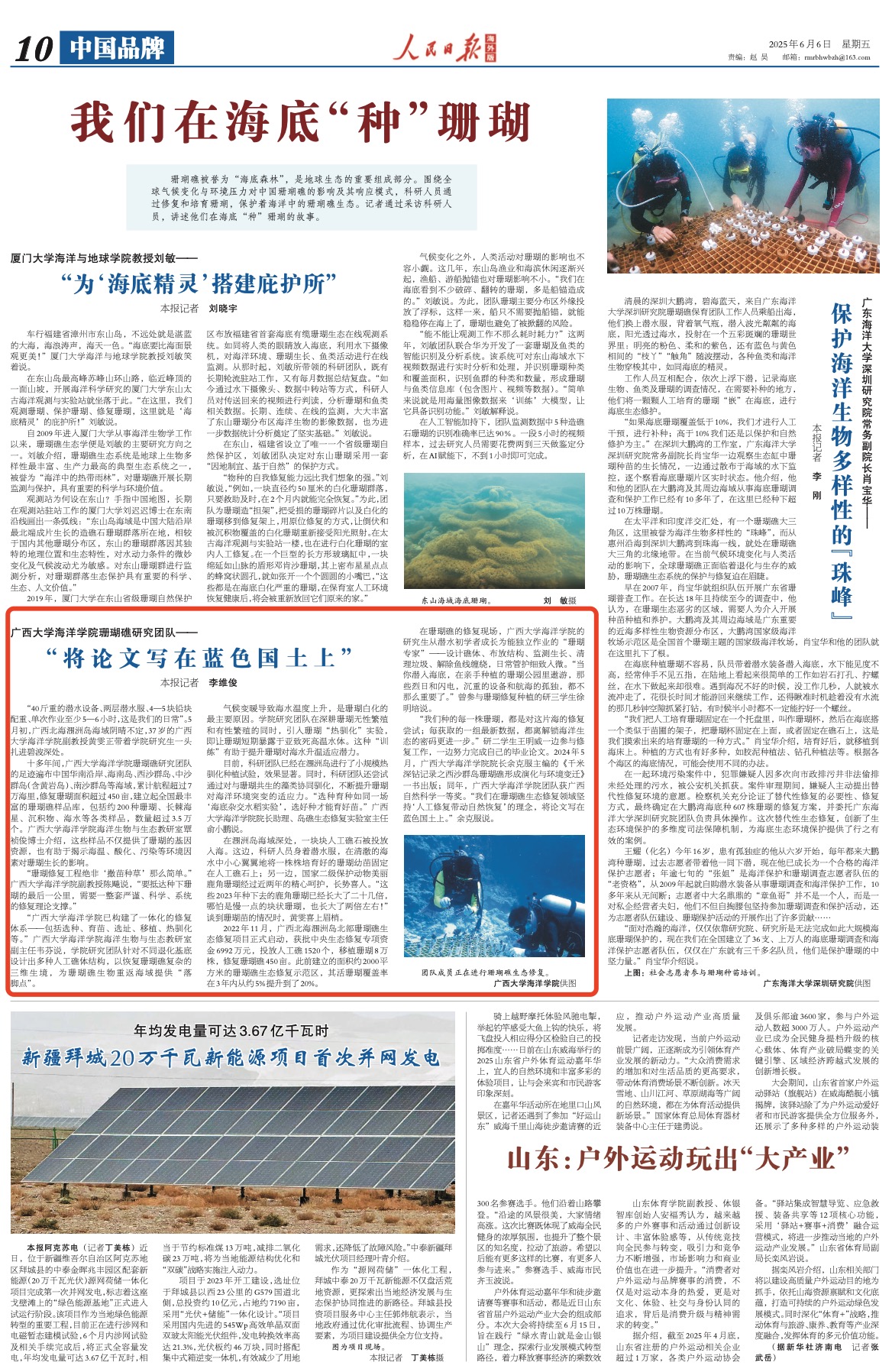 “我们种的每一株珊瑚,都是对这片海的修复尝试;每获取的一组最新数据,都离解锁海洋生态的密码更进一步。”研二学生王明威一边参与修复工作,一边努力完成自己的毕业论文。2024年5月,beat365正版唯一官网必一海洋学院院长余克服主编的《千米深钻记录之西沙群岛珊瑚礁形成演化与环境变迁》一书出版;同年,beat365正版唯一官网必一海洋学院团队获广西自然科学一等奖。“我们在珊瑚礁生态修复领域坚持‘人工修复带动自然恢复’的理念,将论文写在蓝色国土上。”余克服说。