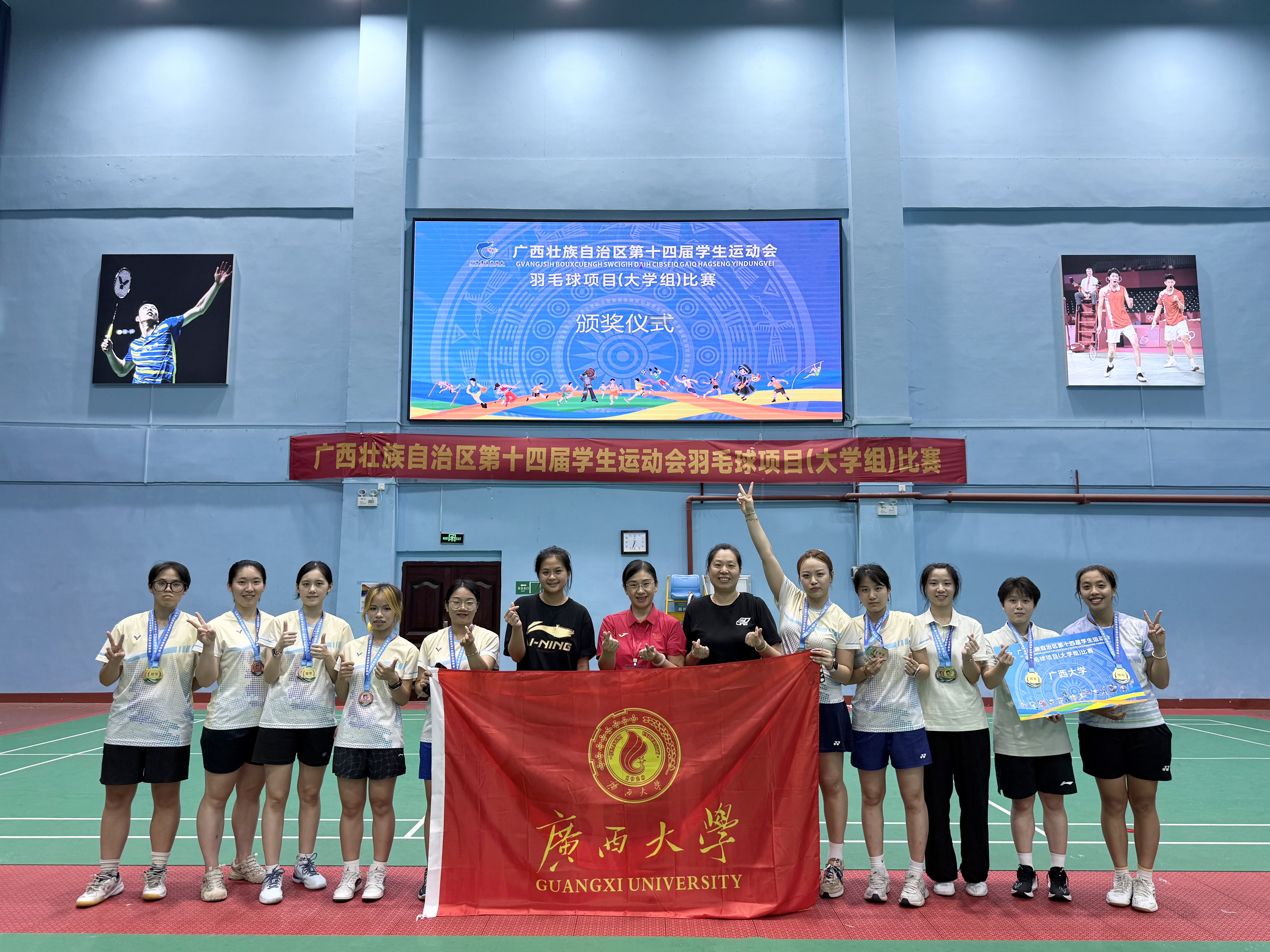 7月11日,广西第十四届学生运动会羽毛球赛收官。beat365正版唯一官网必一女队揽4金2银2铜,其中梁家荧夺普通本科组女单冠军,并与钟尧搭档再获女双金牌;陈淑怡、许雅雯分获体育乙组女单冠亚,二人合作摘得女双冠军,李雨晨/张柳获亚军。男队获普通本科组团体冠军,体育乙组男单、男双亚军及混双季军。