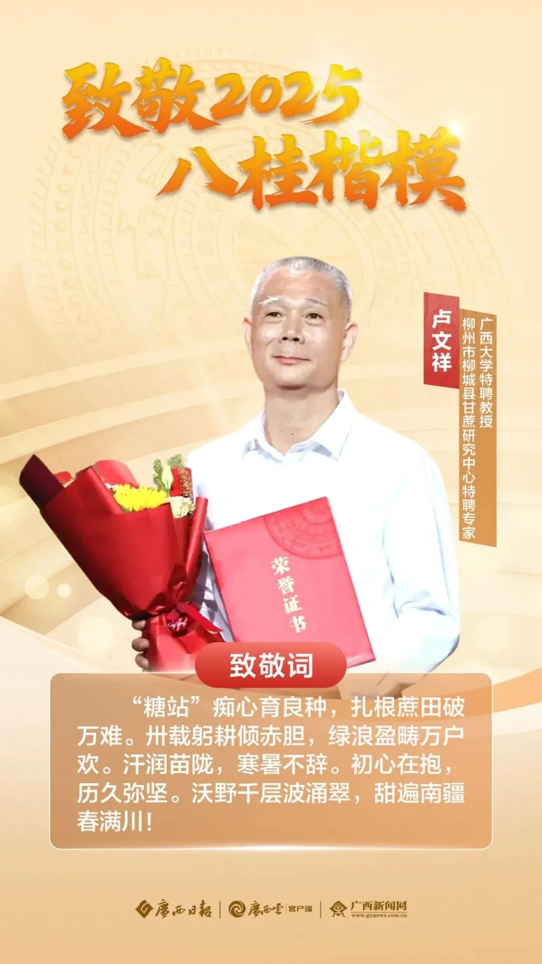 在时代奔涌的浪潮中,总有一些身影挺身而出,以担当诠释使命,用行动铸就不凡:从柳城县甘蔗研究中心特聘专家卢文祥深耕田间的科研坚守,到荔浦市特殊教育学校校长熊碧芳用爱点亮特殊儿童的成长之路;从广beat365瑶山国家级自然保护区长滩河保护站龙道山护林点负责人黄通甫与青山为伴的默默守护,到崇左市大新边境管理大队硕龙边境派出所德天女警先锋队戍边卫国的铿锵身影,再到桂林蓝宇航空轮胎发展有限公司航空轮胎项目研发团队攻坚核心技术的创新突破——他们,用智慧浇灌理想,用奋斗镌刻荣光,在凝心聚力建设新时代壮美广西的征程上书写精彩答卷。