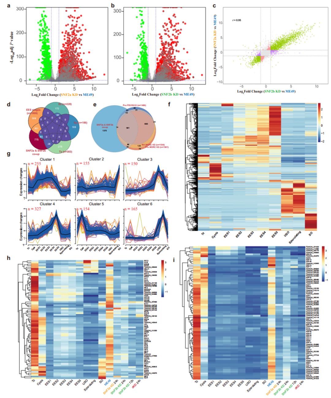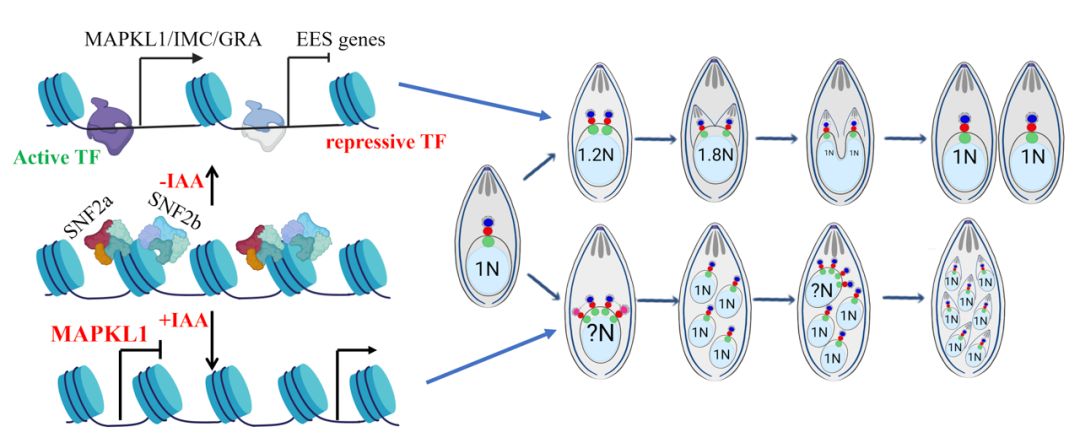 找到了“激活器”。首次揭示SWI/SNF染色质重塑复合体是维持弓形虫速殖子分裂方式所必需的核心激活因子。两个复合体的核心亚基SNF2a和SNF2b是弓形虫速殖子阶段生长所必需的。当复合体功能缺失时,寄生虫的分裂模式会从有序的“一分为二”向混乱的“一分为多”发生转变,并错误地启动了本应被抑制的其他发育阶段的转录程序。SWI/SNF复合体作为染色质重塑因子,通过维持速殖子关键基因转录起始区域的染色质开放性来确保其正常表达,并与已知的抑制因子MORC复合体协同作用,实现了对基因表达的双重调控,从而确保寄生虫基因表达和分裂过程的准确性。