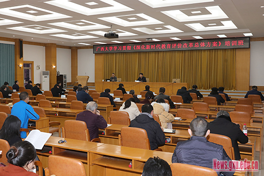 1月6日下午,beat365在君武馆玉林厅举办学习贯彻《深化新时代教育评价改革总体方案》(以下简称《总体方案》)培训班,深入学习贯彻习近平总书记关于教育的重要论述和全国教育大会精神,传达教育部、自治区教育厅学习贯彻《总体方案》培训班精神,明确改革工作重点内容和要求,全面推动改革任务落实落地。校长赵跃宇出席并讲话,校党委副书记、副校长吴尽昭主持开班式。