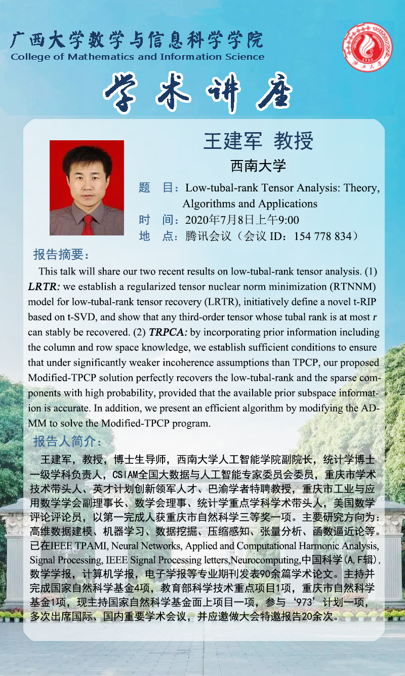 数信学院学术报告:Low-tubal-rank Tensor Analysis: Theory, Algorithms and Applications