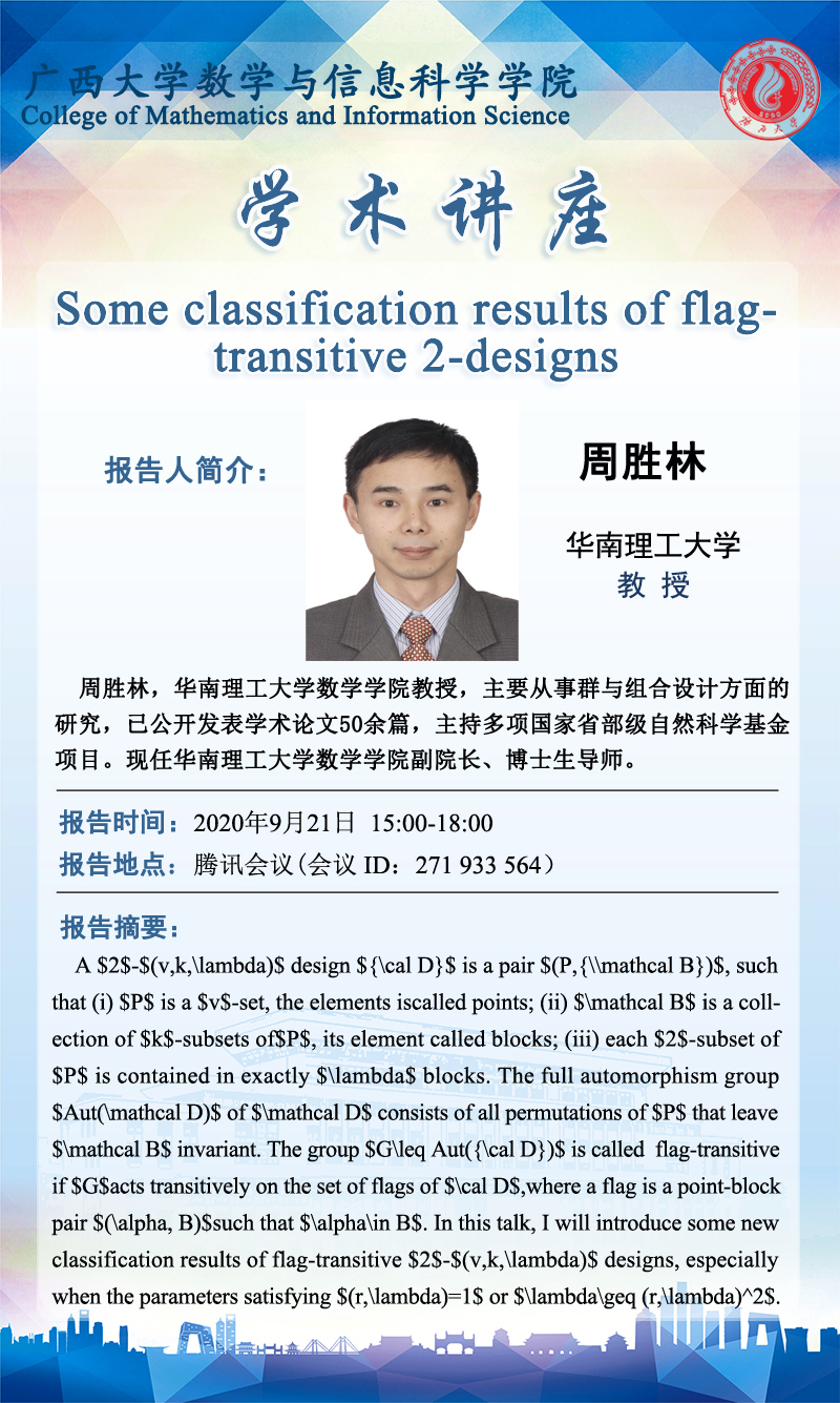 下一条:数学与信息科学学院学术讲座:The number of edges, spectral radius and Hamilton-connectedness of graphs