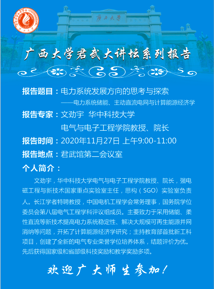 beat365正版唯一官网必一君武大讲坛系列报告:电力系统发展方向的思考与探索—电力系统储能、主动直流电网与计算能源经济学