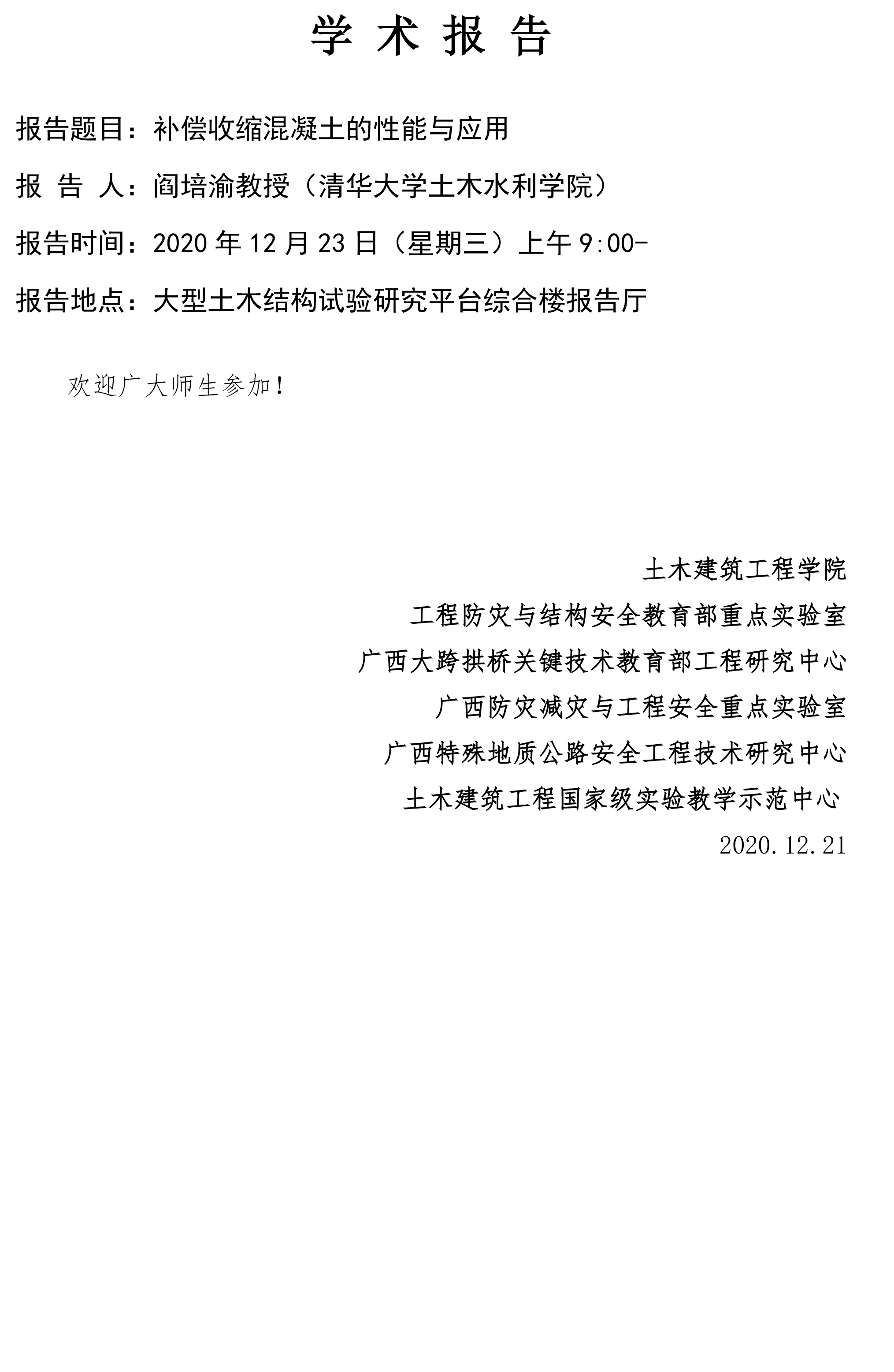 土木建筑工程学院学术报告:补偿收缩混凝土的性能与应用