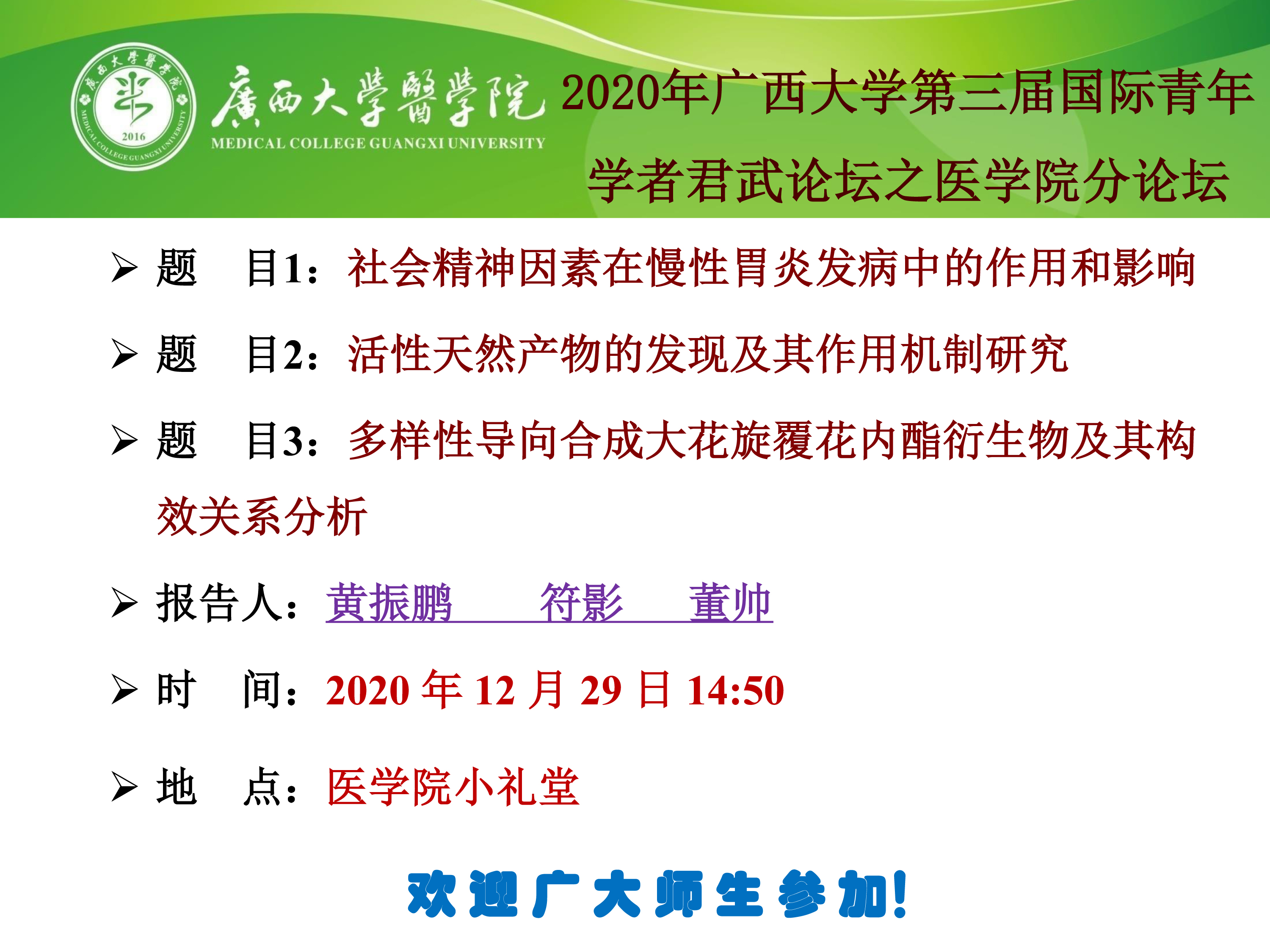 2020年beat365正版唯一官网必一第三届国际青年学者君武论坛之医学院分论坛:社会精神因素在慢性胃炎发病中的作用和影响;活性天然产物的发现及其作用机制研究;多样性导向合成大花旋覆花内酯衍生物及其构效关系分析;