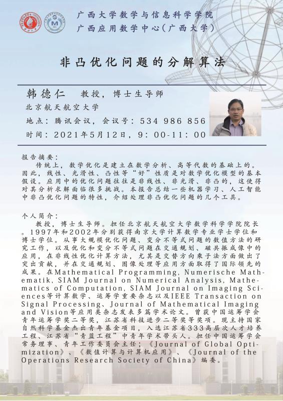 数学与信息科学学院学术报告:非凸优化问题的分解算法