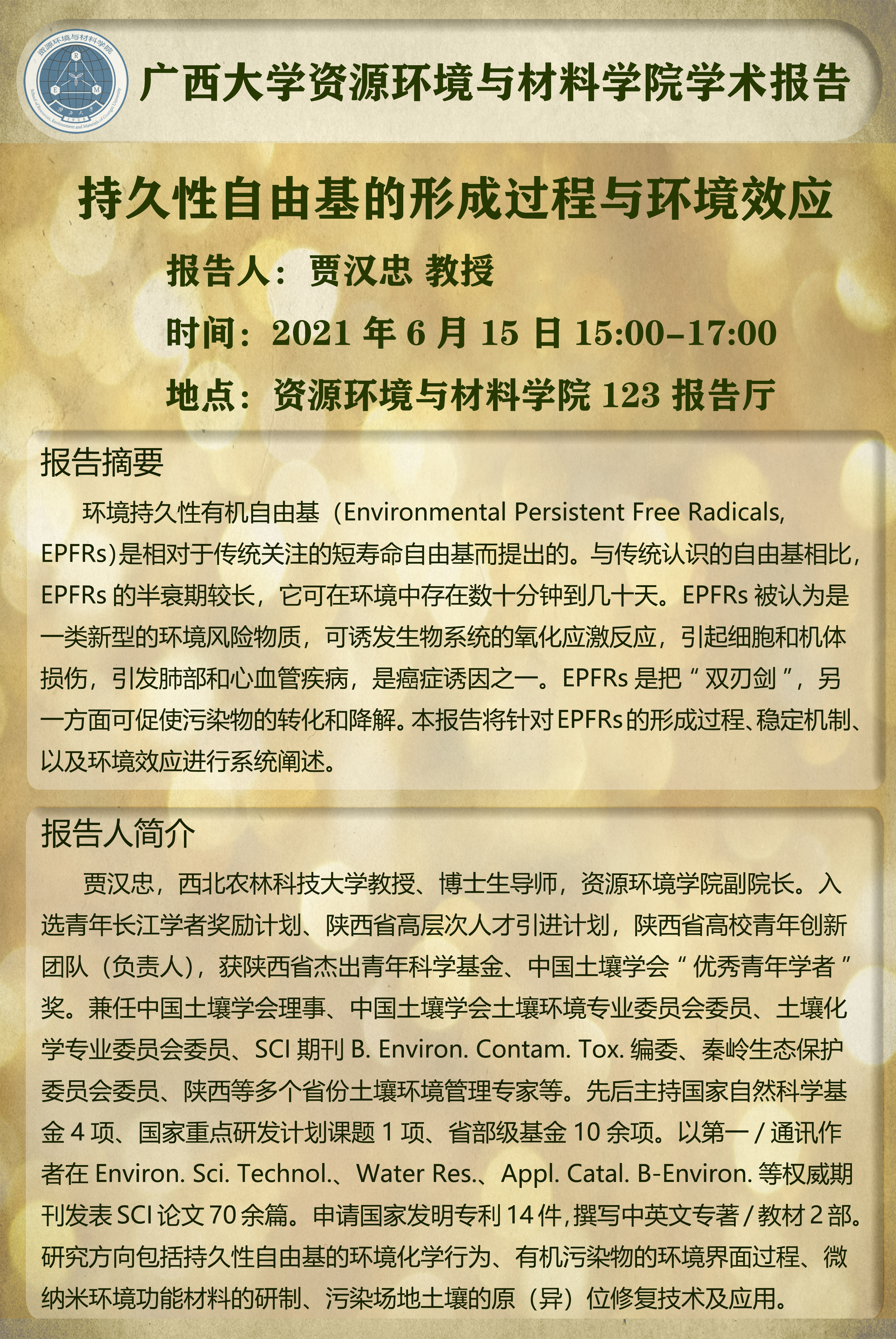 资源环境与材料学院学术报告:持久性自由基的形成过程与环境效应