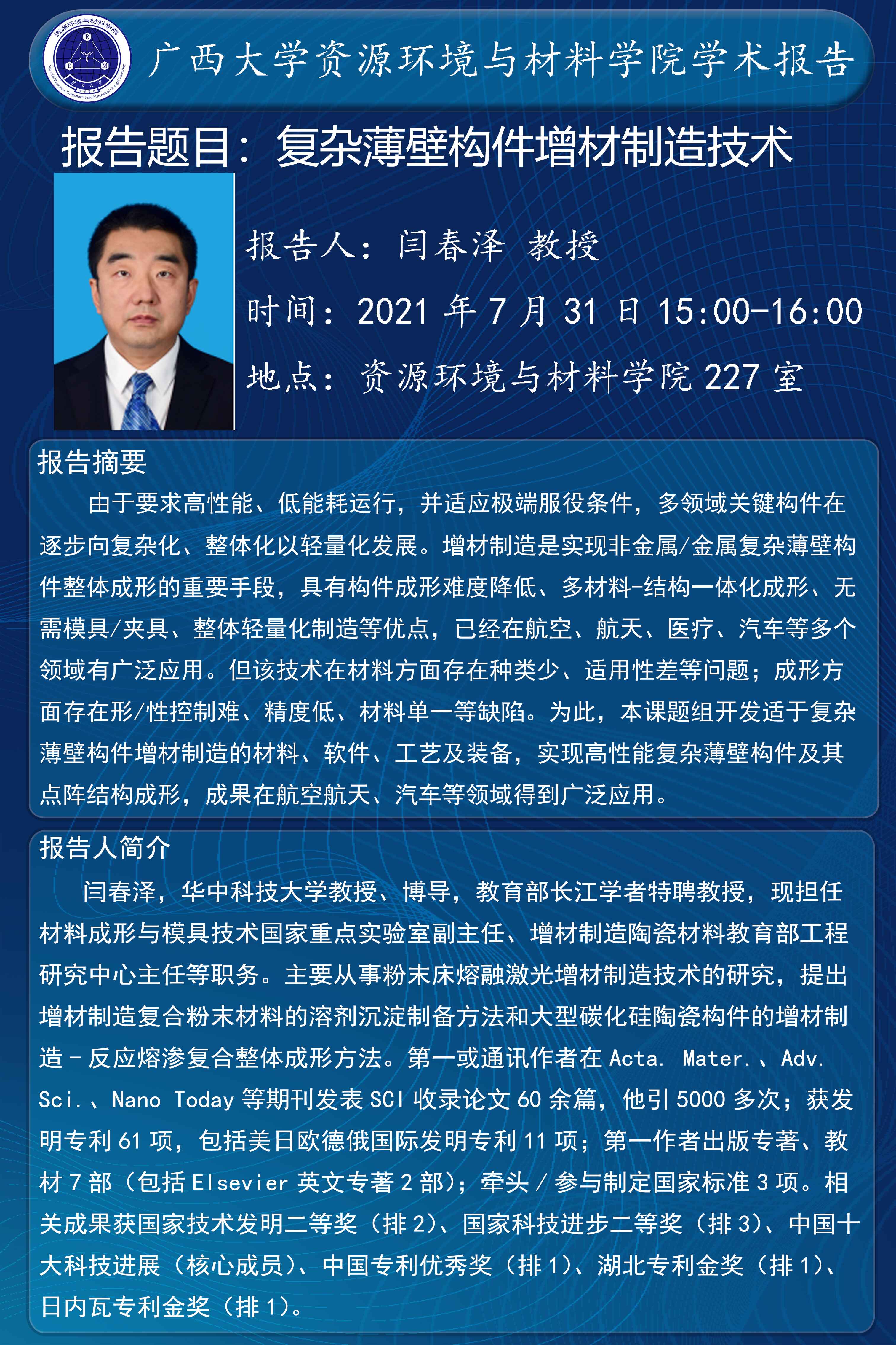 资源环境与材料学院学术报告:复杂薄壁构件增材制造技术