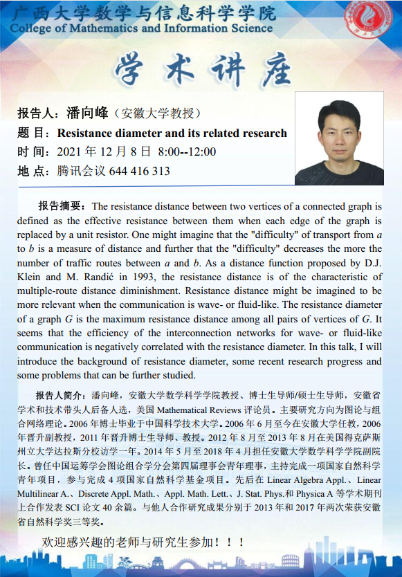 数信学院学术报告: Resistance diameter and its related research