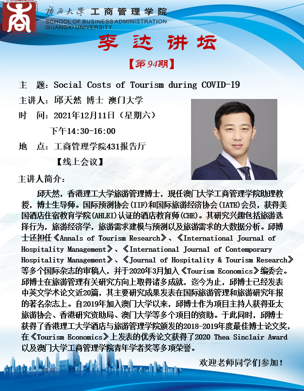 工商管理学院李达讲坛:Social Costs of Tourism during COVID-19 Pandemic