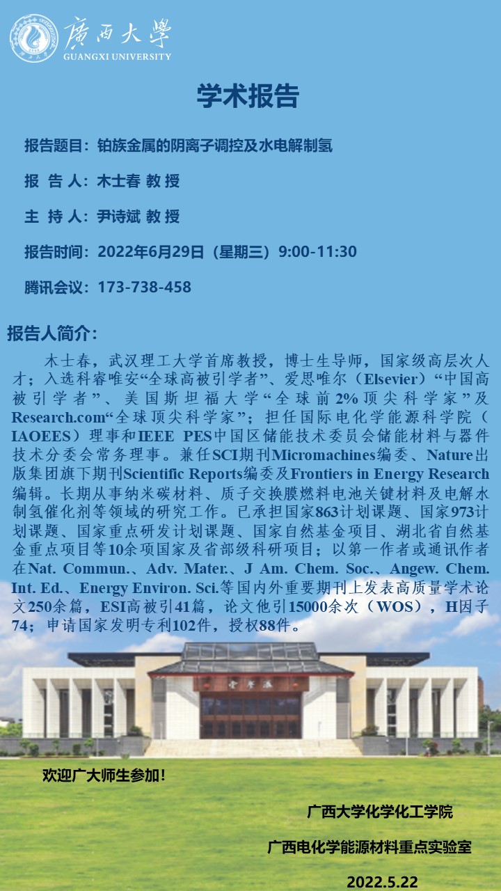 化学化工学院建院九十周年系列学术报告:铂族金属的阴离子调控及水电解制氢