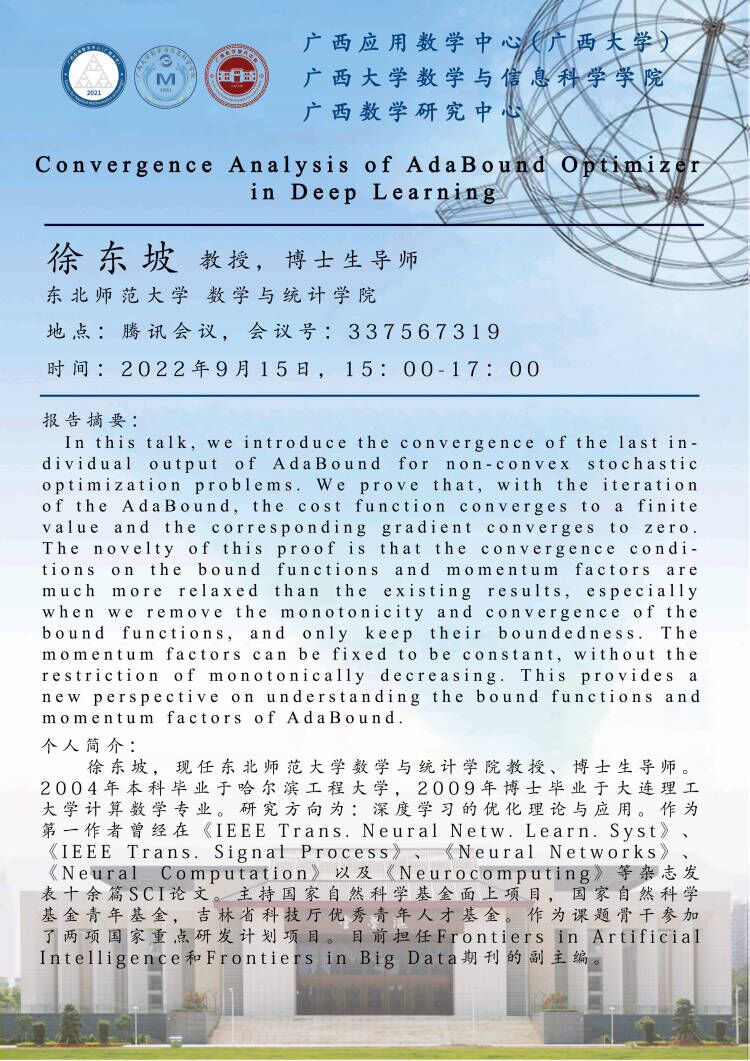 数学与信息科学学院 广西应用数学中心(beat365正版唯一官网必一)学术报告:Convergence Analysis of AdaBound Optimizer in Deep Learning