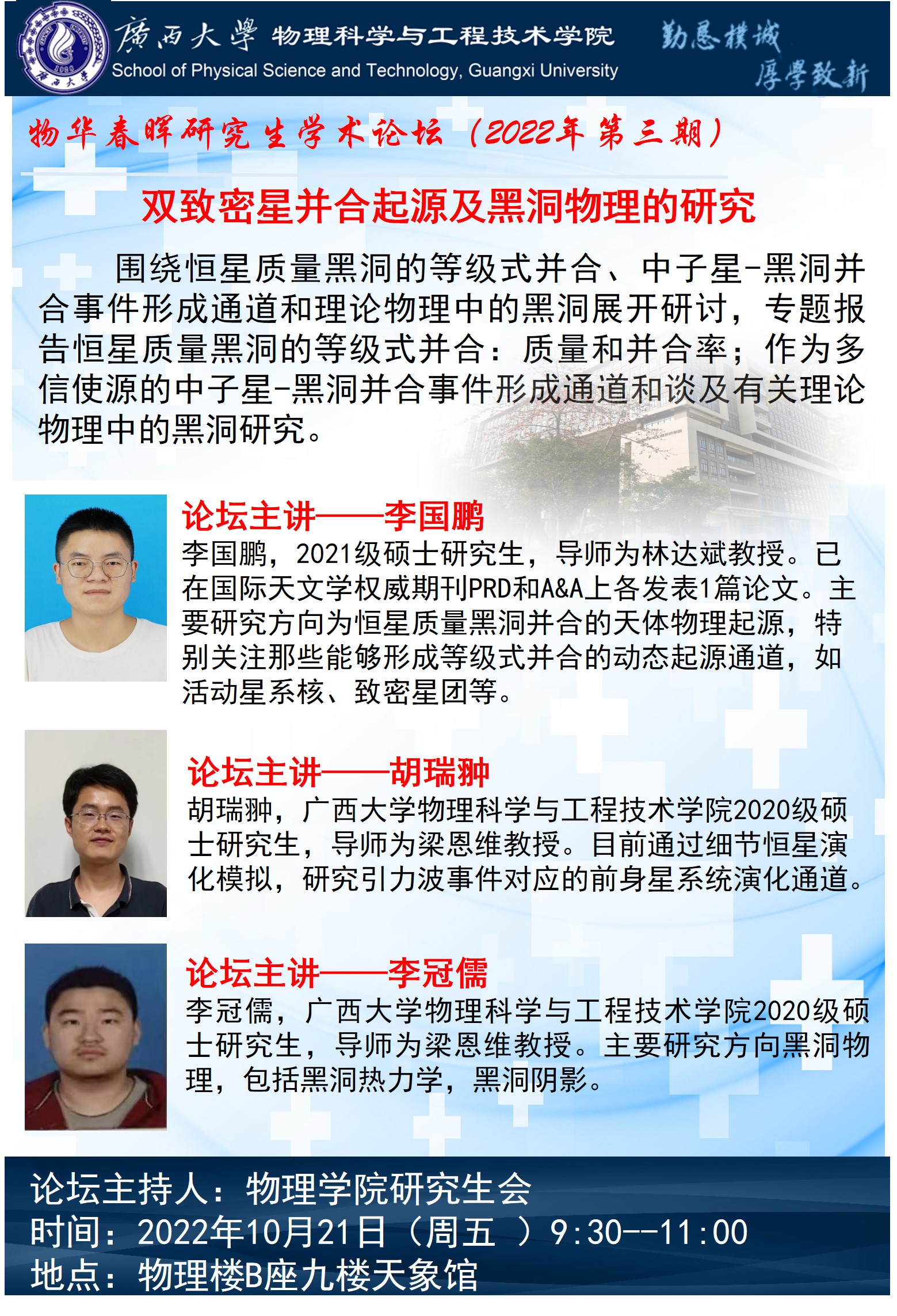物理学院物华春晖学术论坛(第三期):双致密星并合起源及黑洞物理的研究