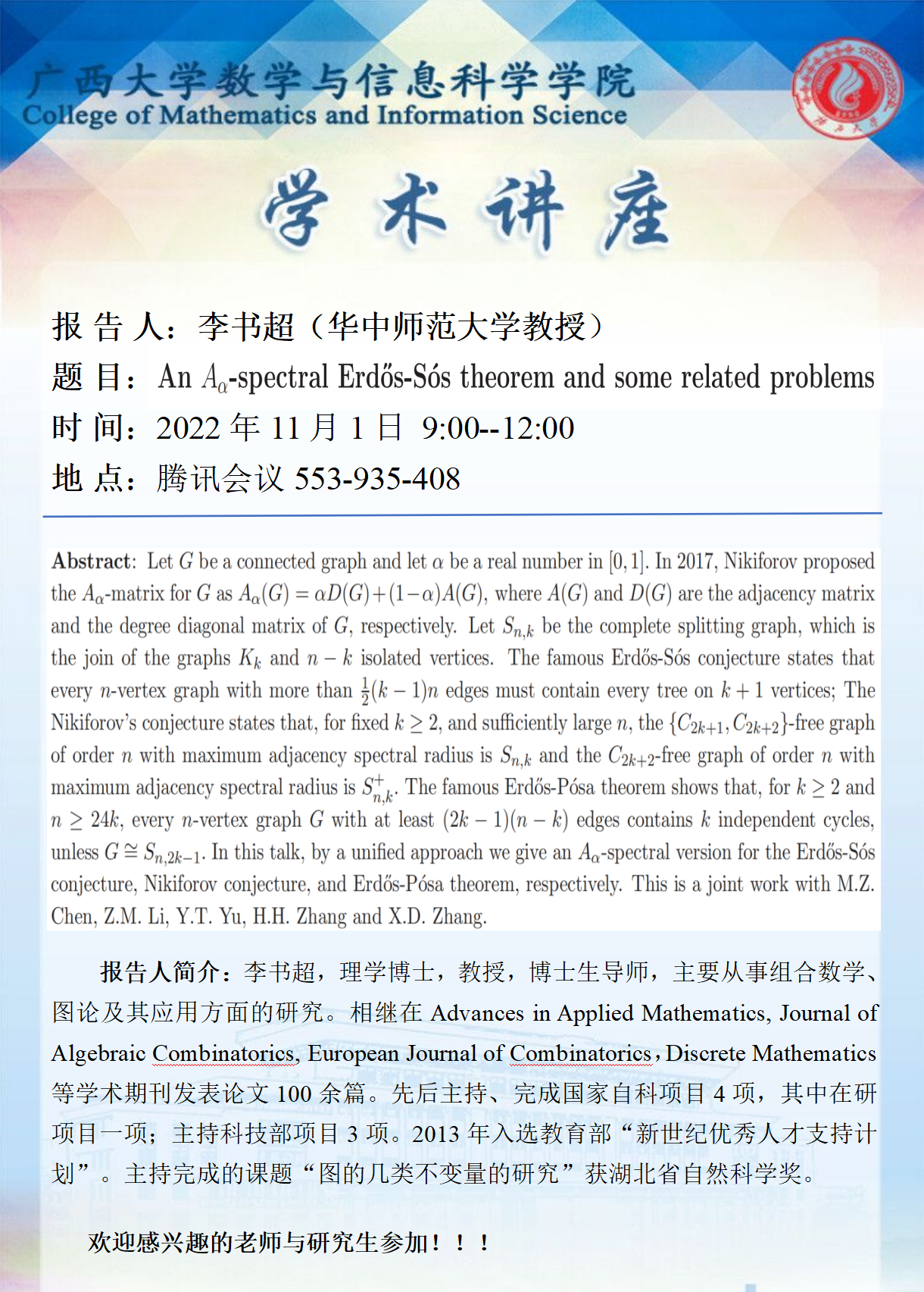 下一条:数学与信息科学学院/广西应用数学中心(beat365正版唯一官网必一)学术报告:Numerical Methods for Distributed Stochastic Compositional Optimization Problems