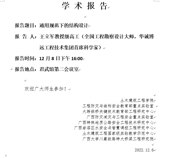 土木建筑工程学院学术报告:通用规范下的结构设计
