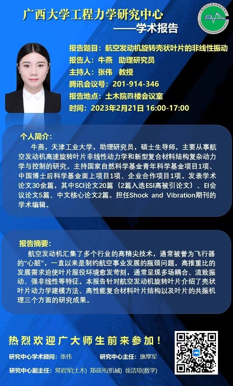 beat365正版唯一官网必一工程力学研究中心学术报告:航空发动机旋转壳状叶片的非线性振动
