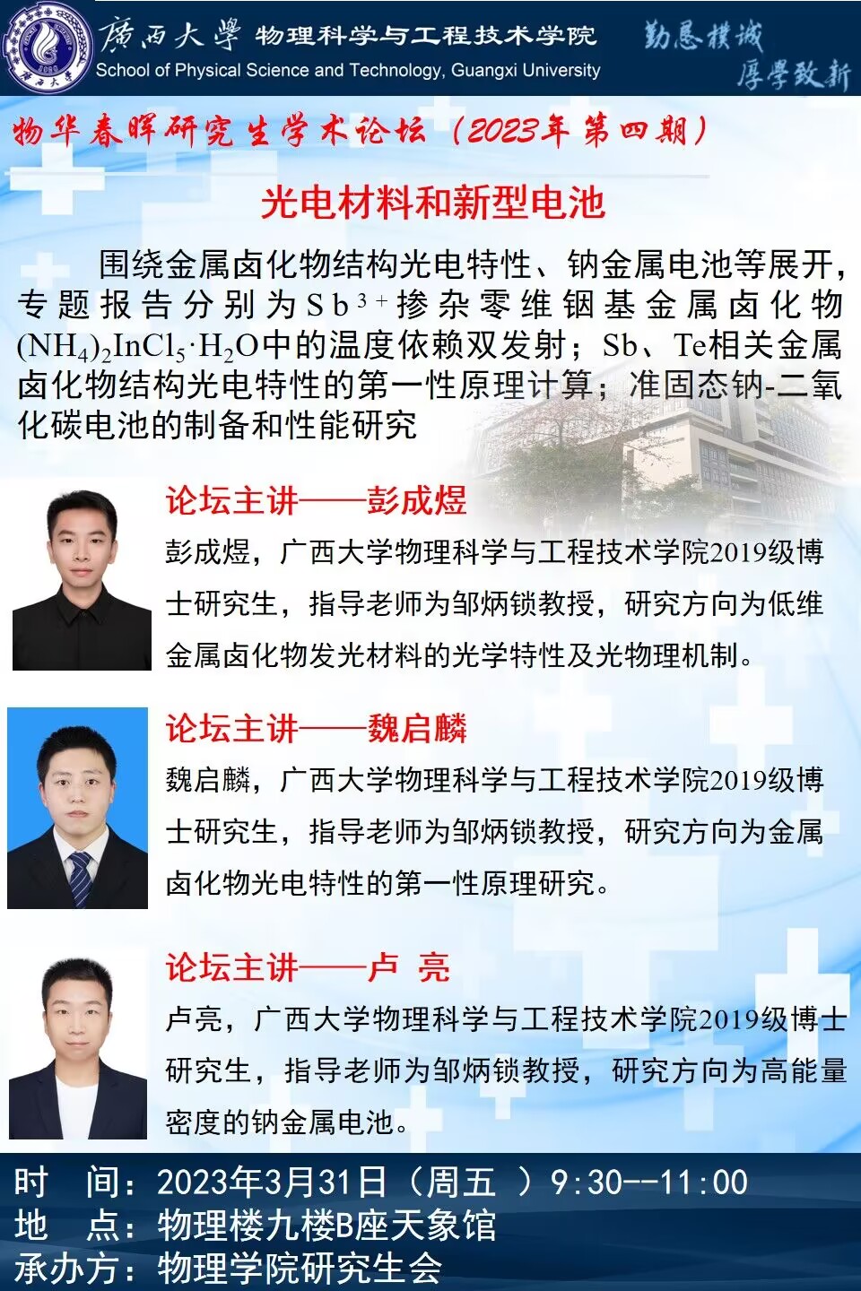物理学院2023年物华春晖学术论坛(第四期):光电材料和新型电池