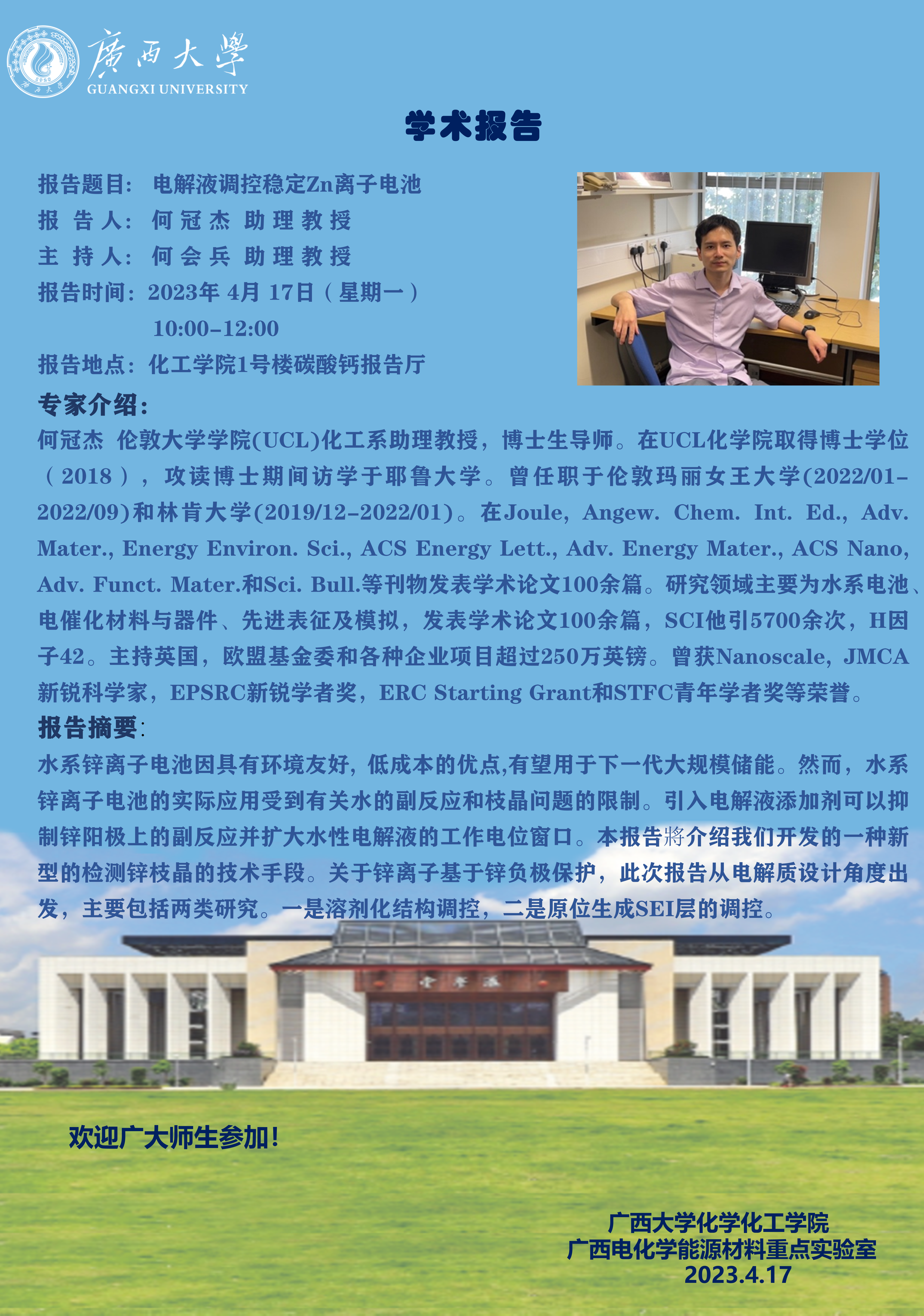 化学化工学院2023年学术报告(第二期):电解液调控稳定Zn离子电池