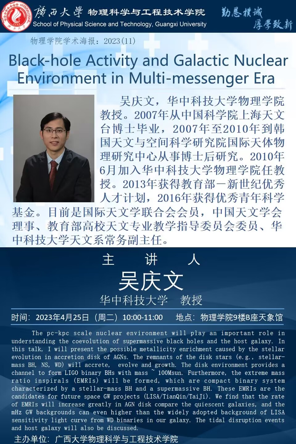 物理学院2023年学术报告系列之11:Black-hole Activity and Galactic Nuclear Environment in Multi-messenger Era