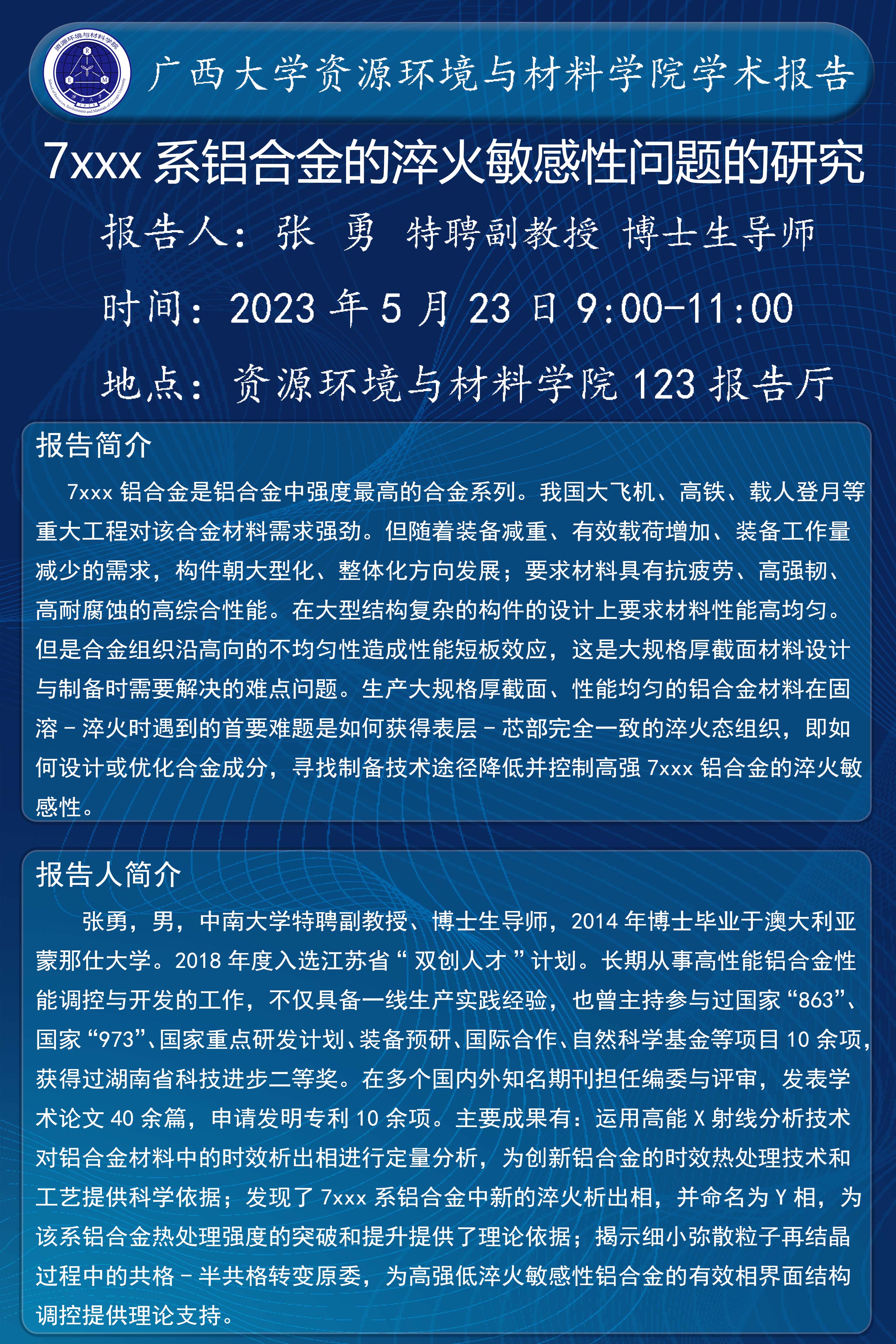 资源环境与材料学院学术报告:7xxx系铝合金的淬火敏感性问题的研究