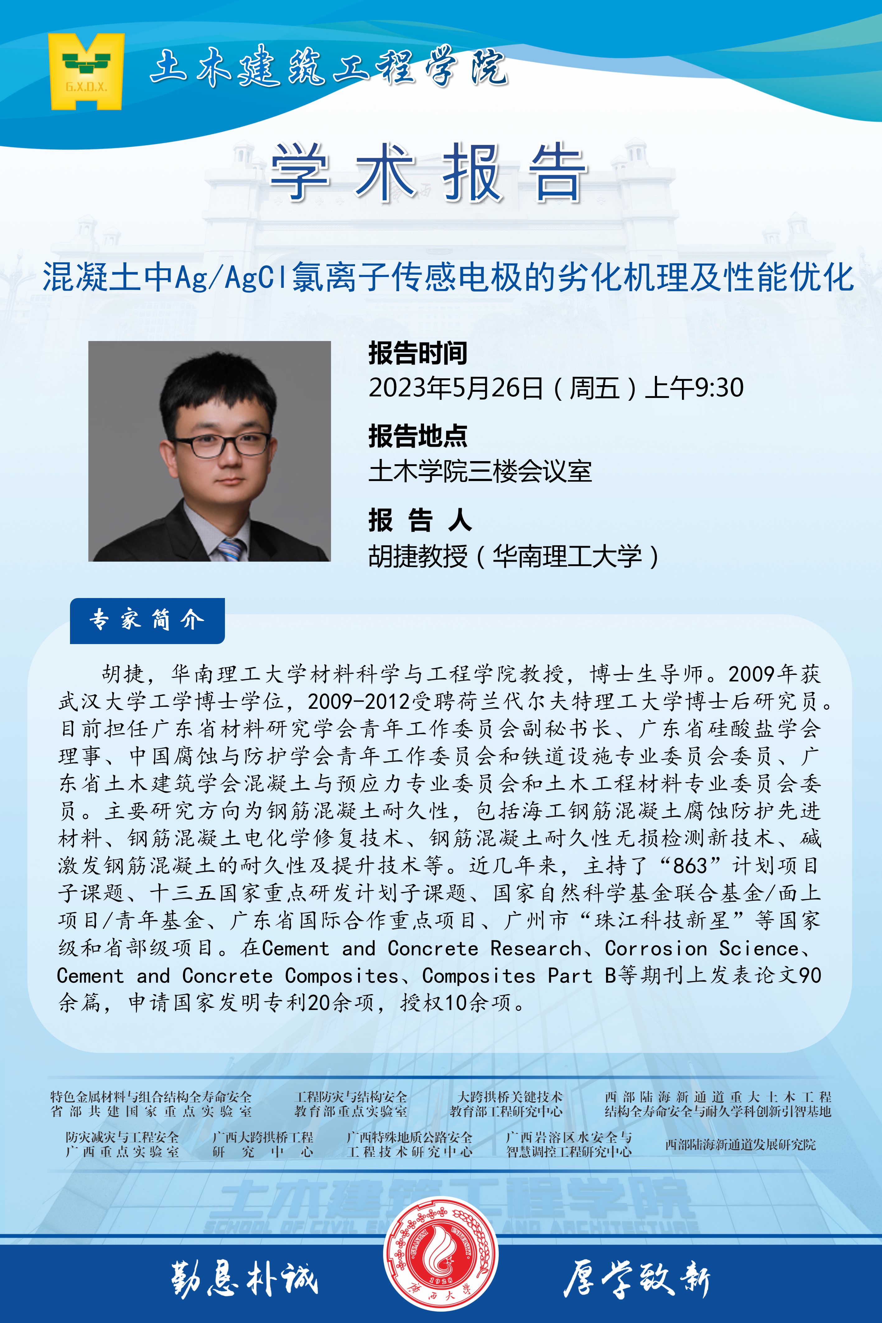 土木建筑工程学院学术报告:混凝土中Ag/AgCl氯离子传感电极的劣化机理及性能优化