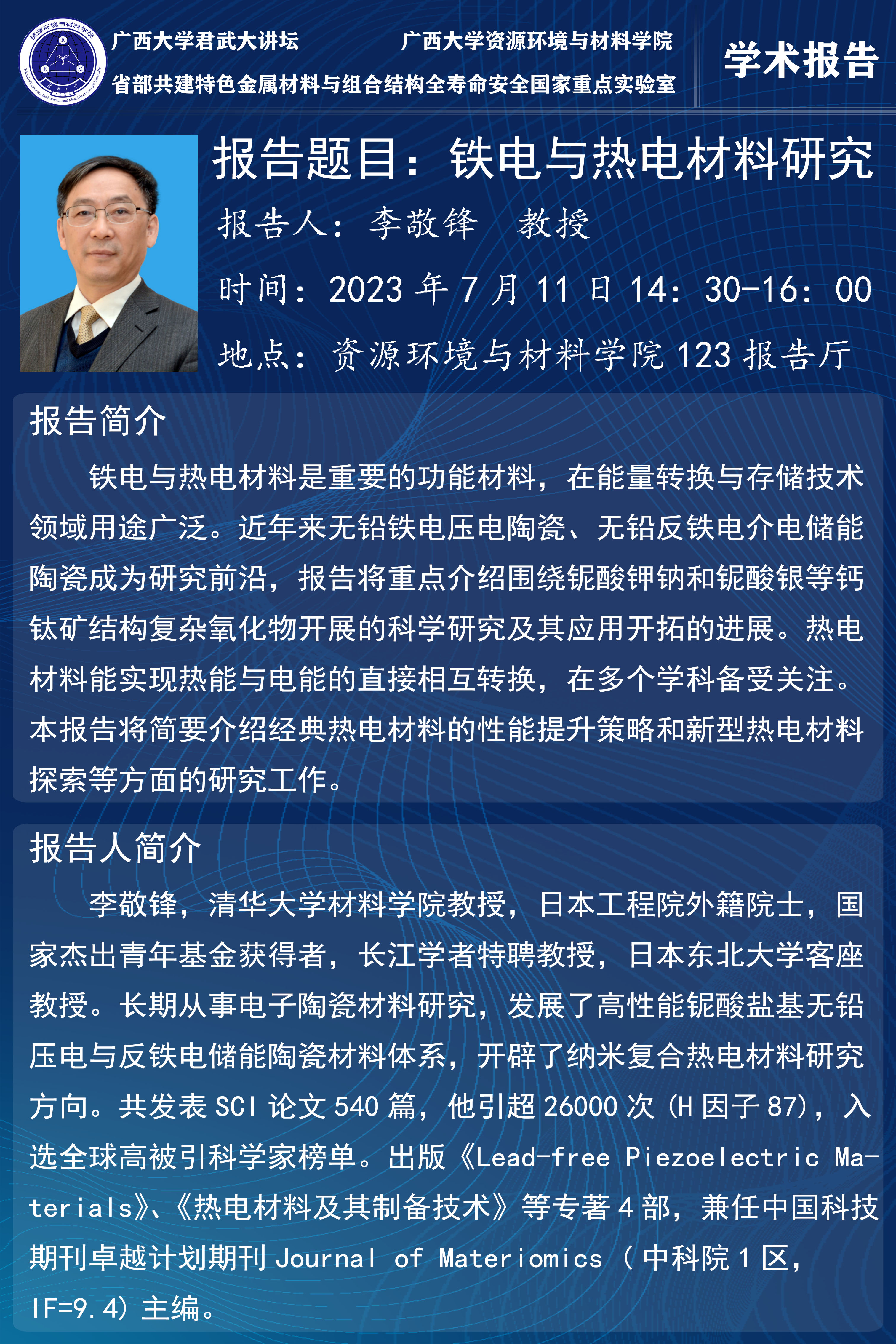 beat365正版唯一官网必一君武大讲坛:铁电与热电材料研究