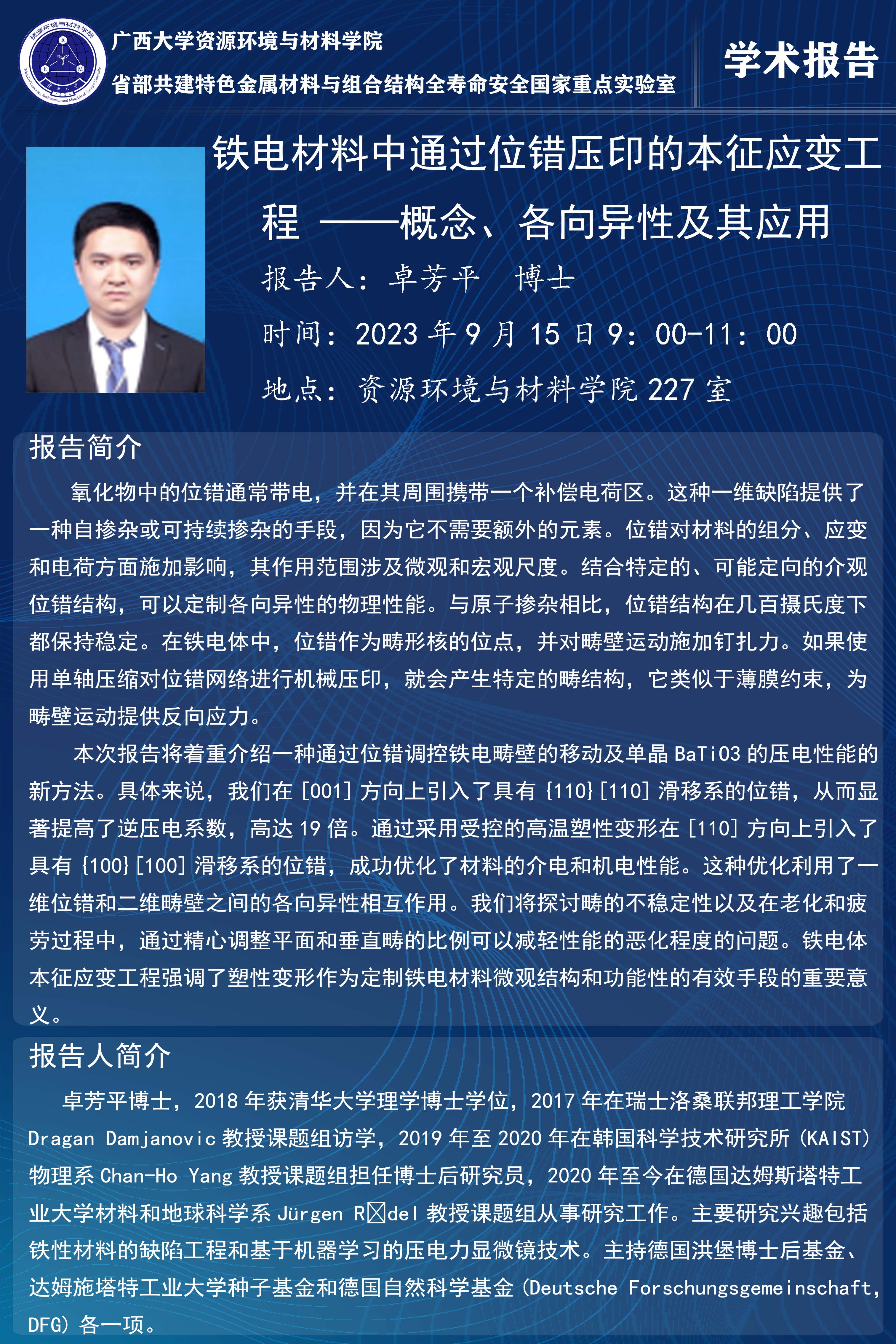 资源环境与材料学院学术报告:铁电材料中通过位错压印的本征应变工程 ——概念、各向异性及其应用