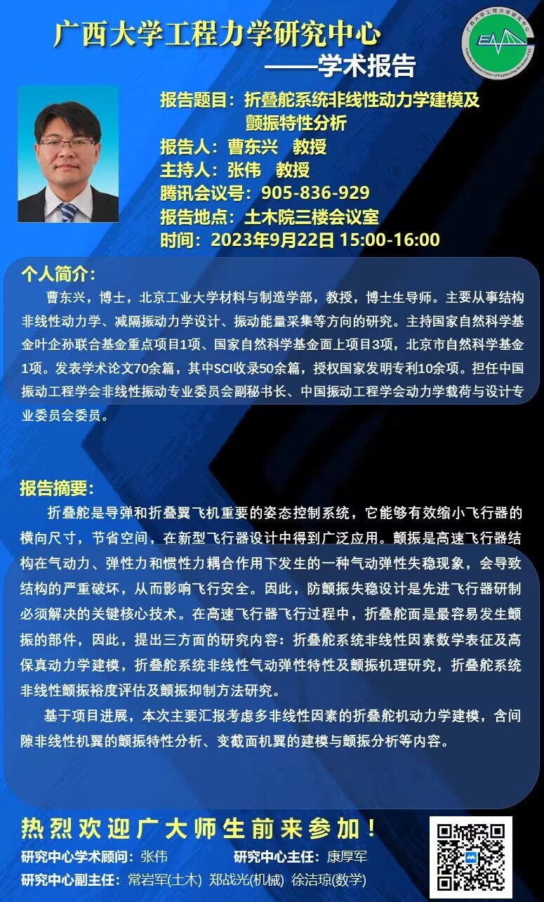 工程力学研究中心学术报告:折叠舵系统非线性动力学建模及颤振特性分析