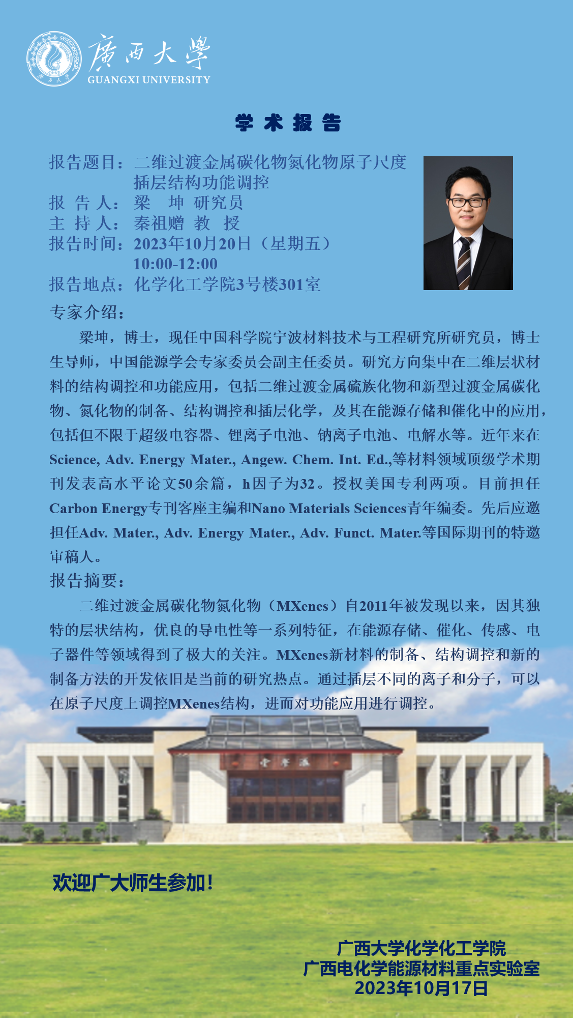化学化工学院学术报告:二维过渡金属碳化物氮化物原子尺度插层结构功能调控