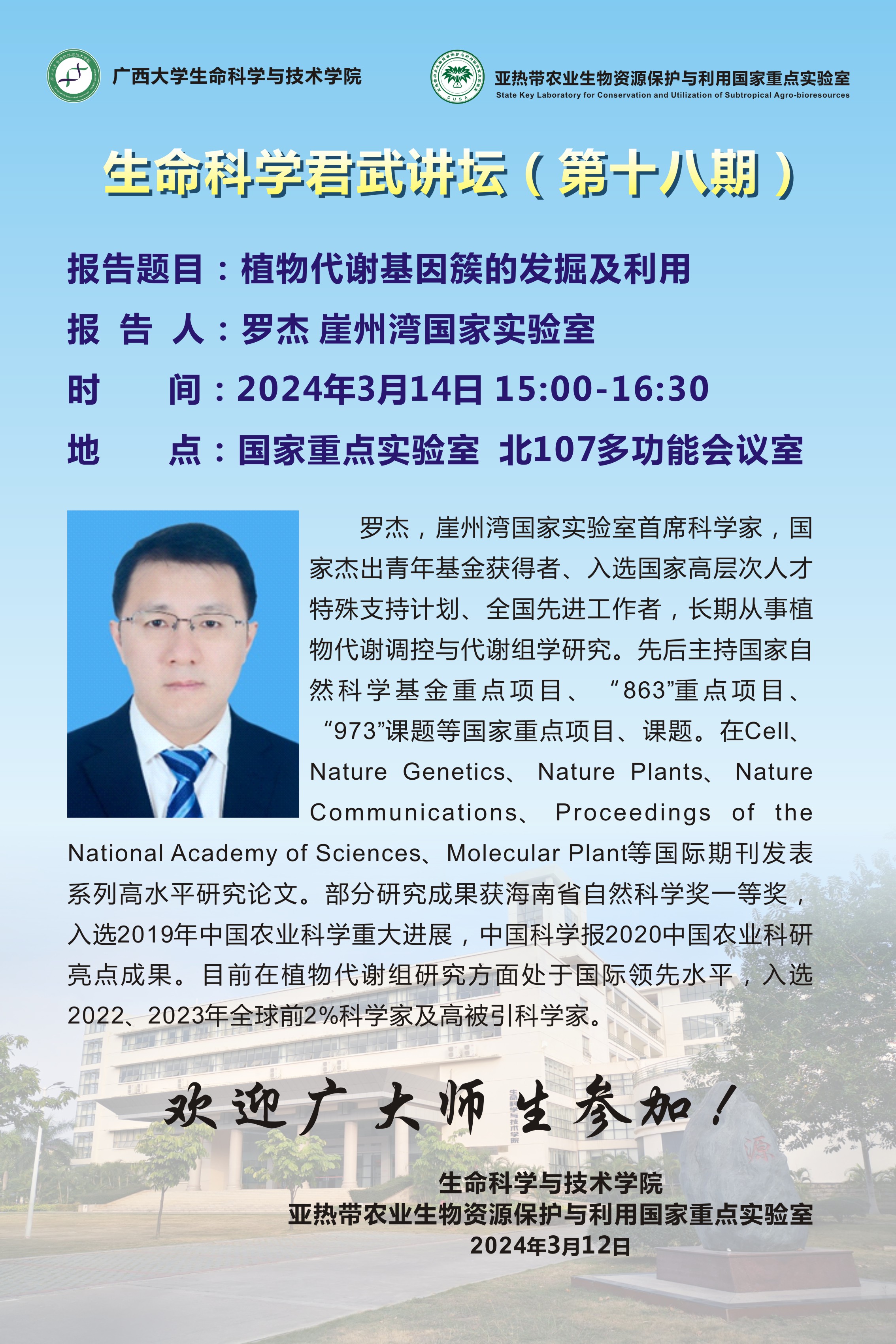 生命科学君武讲坛(第十八期) 报告题目:植物代谢基因簇的发掘及利用