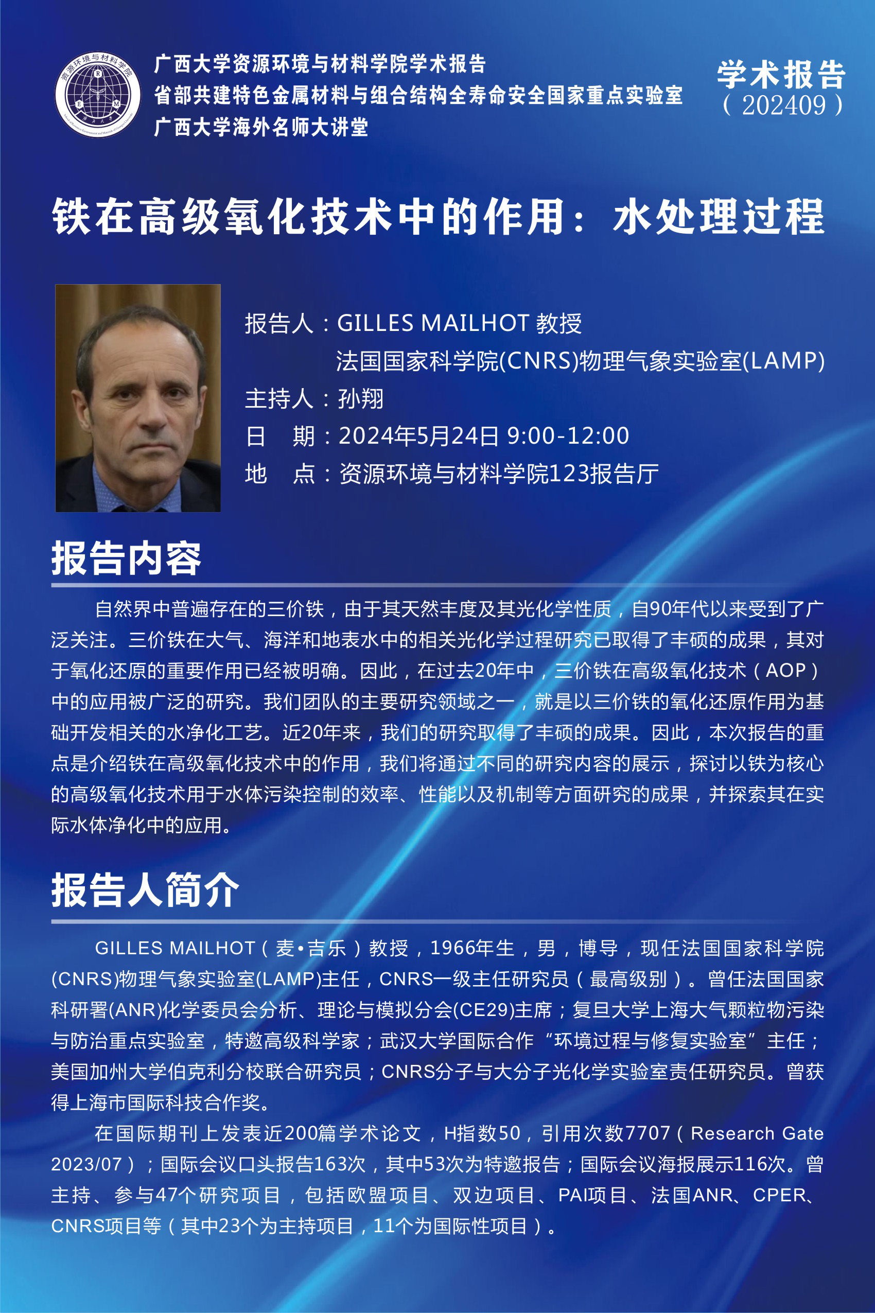 beat365正版唯一官网必一海外名师大讲堂、资源环境与材料学院学术报告 :铁在高级氧化技术中的作用----水处理过程