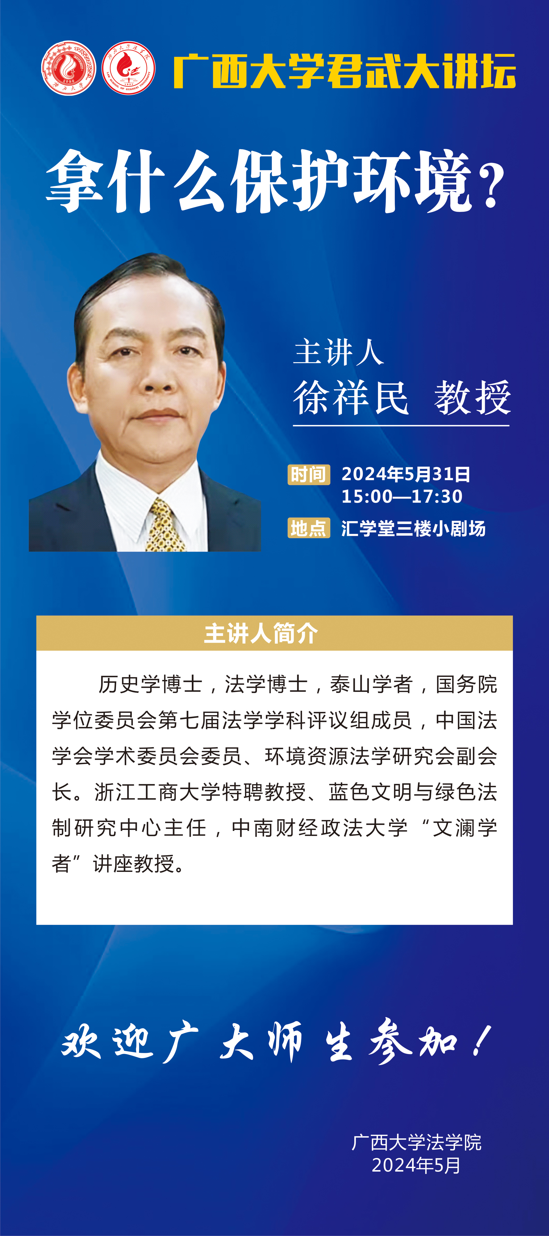 主讲人 徐祥民 浙江工商大学特聘教授 博士生导师 地址 汇学堂三楼小剧场
