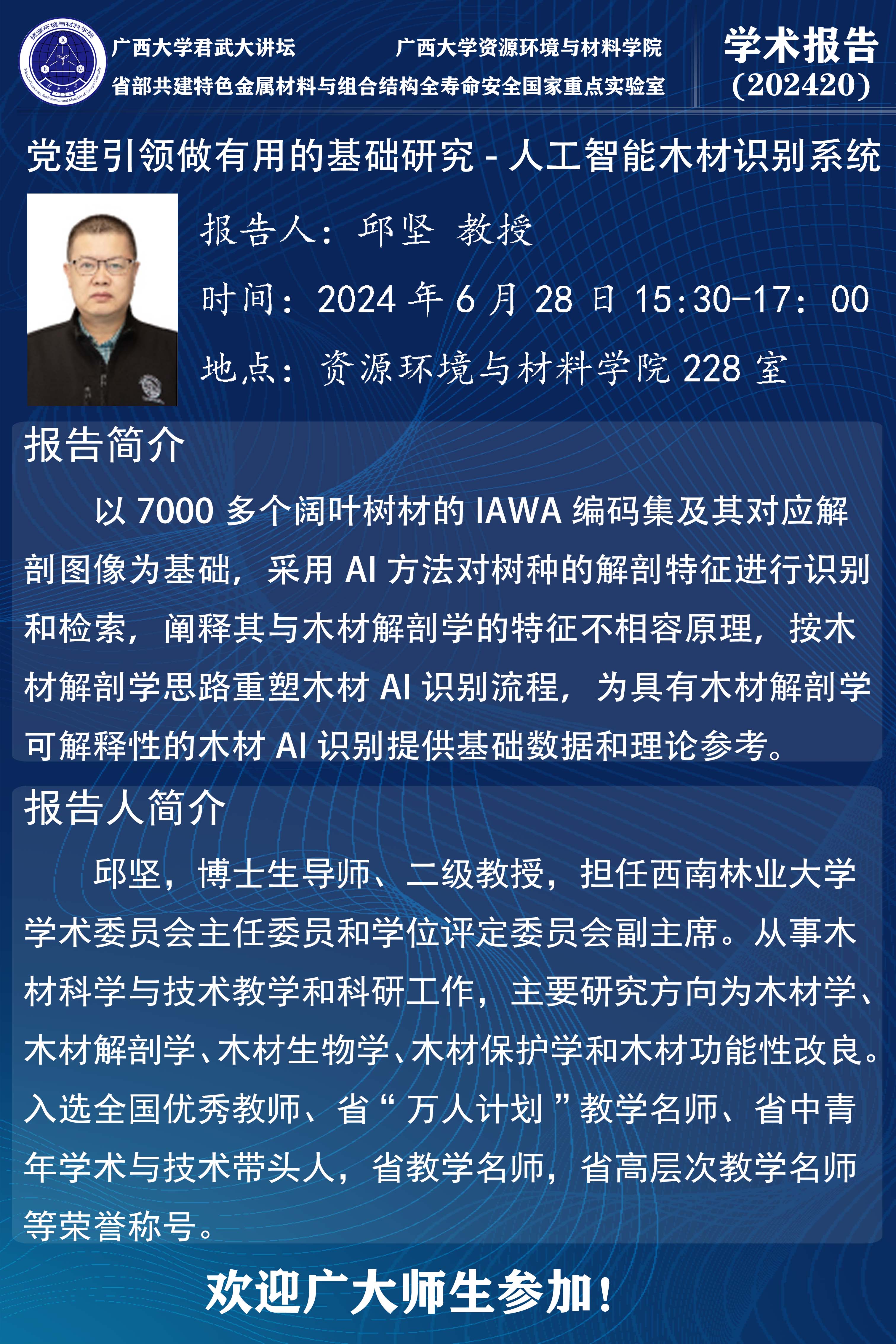 君武大讲坛、资源环境与材料学院学术报告:党建引领做有用的基础研究-人工智能木材识别系统