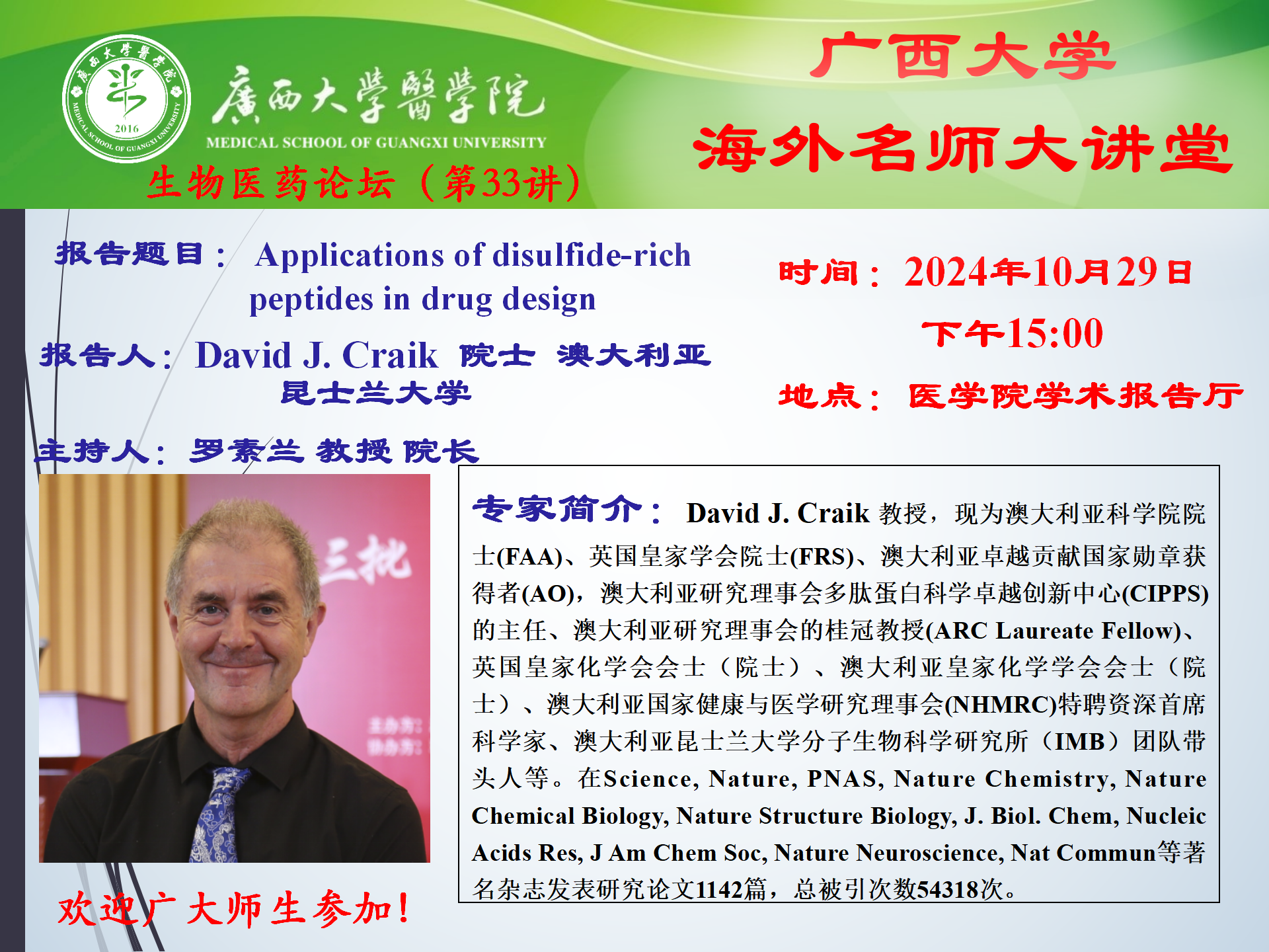 主讲人 David J. Craik 院士 地址 医学院学术报告厅