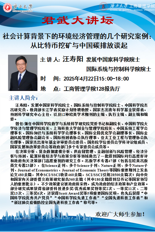 君武大讲坛: 社会计算背景下的环境经济管理的几个研究案例—— 从比特币挖矿与中国碳排放谈起