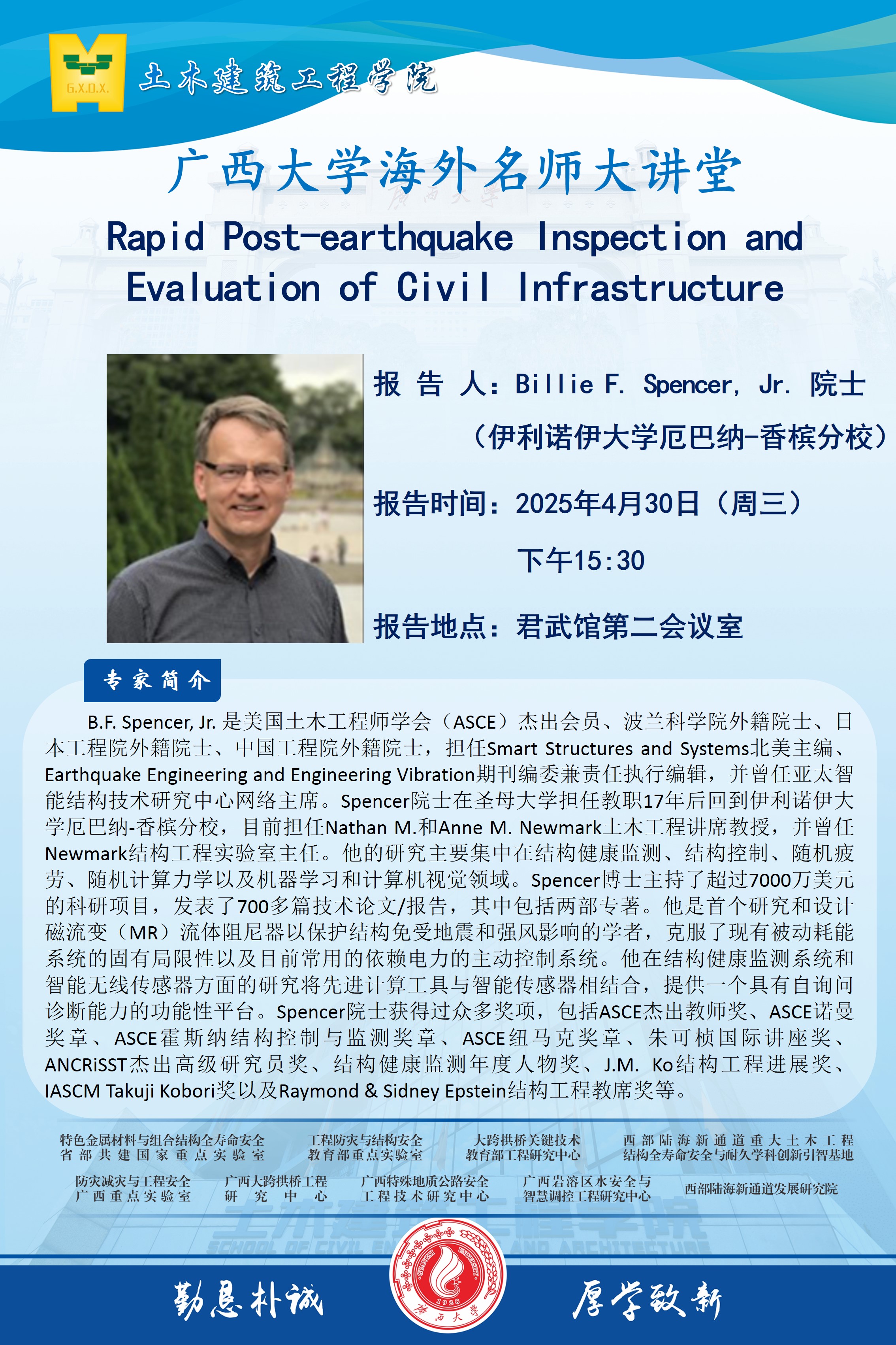 海外名师大讲堂、土木建筑工程学院学术报告:Rapid Post-earthquake Inspection and Evaluation of Civil Infrastructure