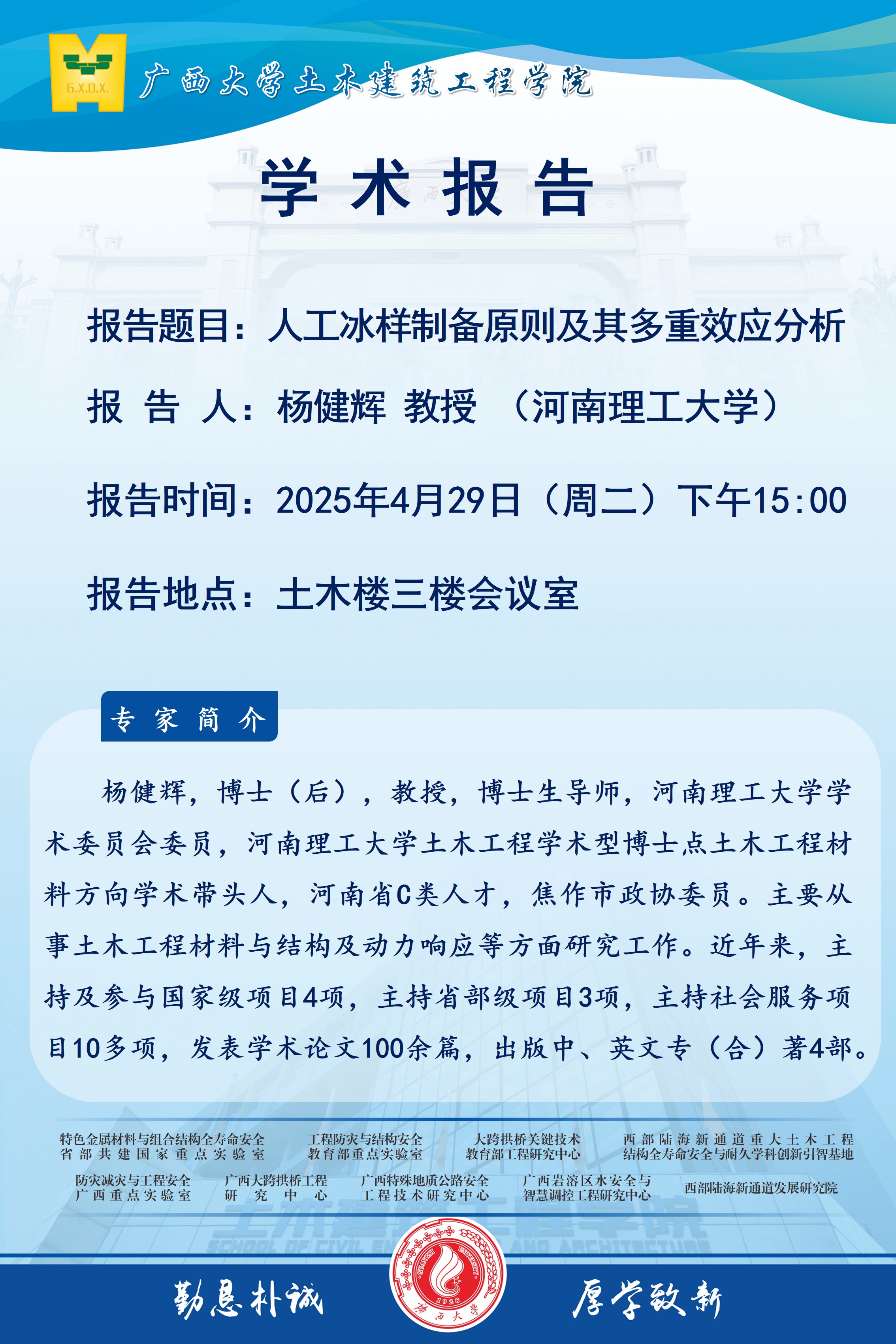 土木建筑工程学院学术报告:人工冰样制备原则及其多重效应分析