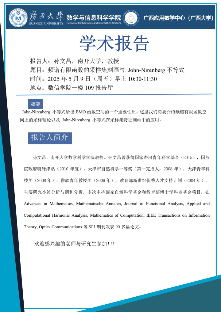数信学院学术报告:频谱有限函数的采样集刻画与John-Nirenberg不等式