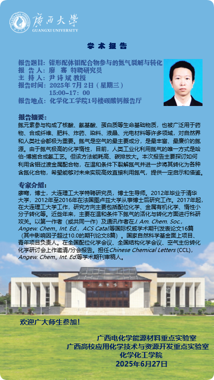 化学化工学院学术报告:钳形配体钼配合物参与的氮气裂解与转化