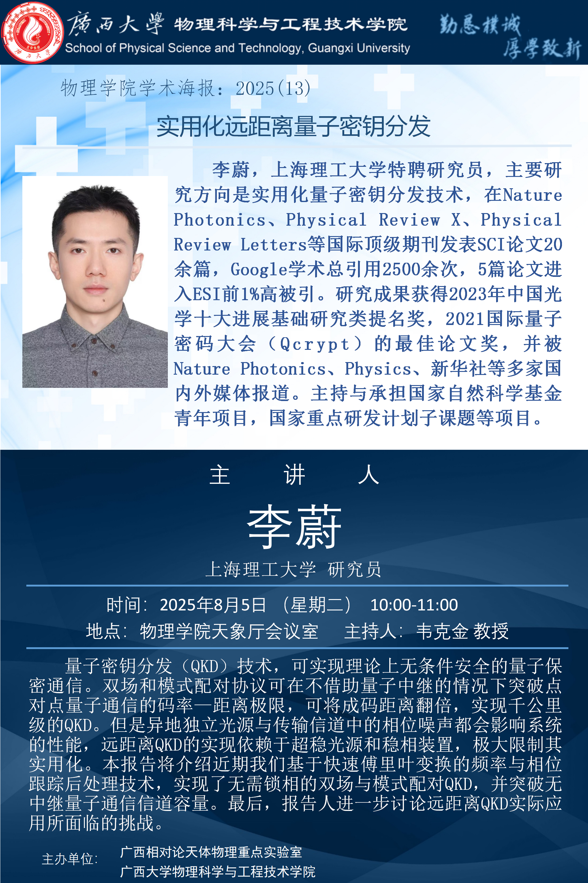 物理科学与工程技术学院学术报告:实用化远距离量子密钥分发
