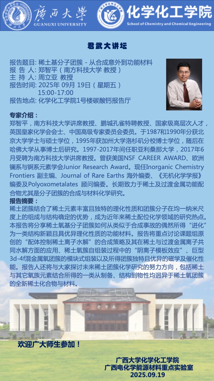 君武大讲坛:稀土基分子团簇 —— 从合成意外到功能材料