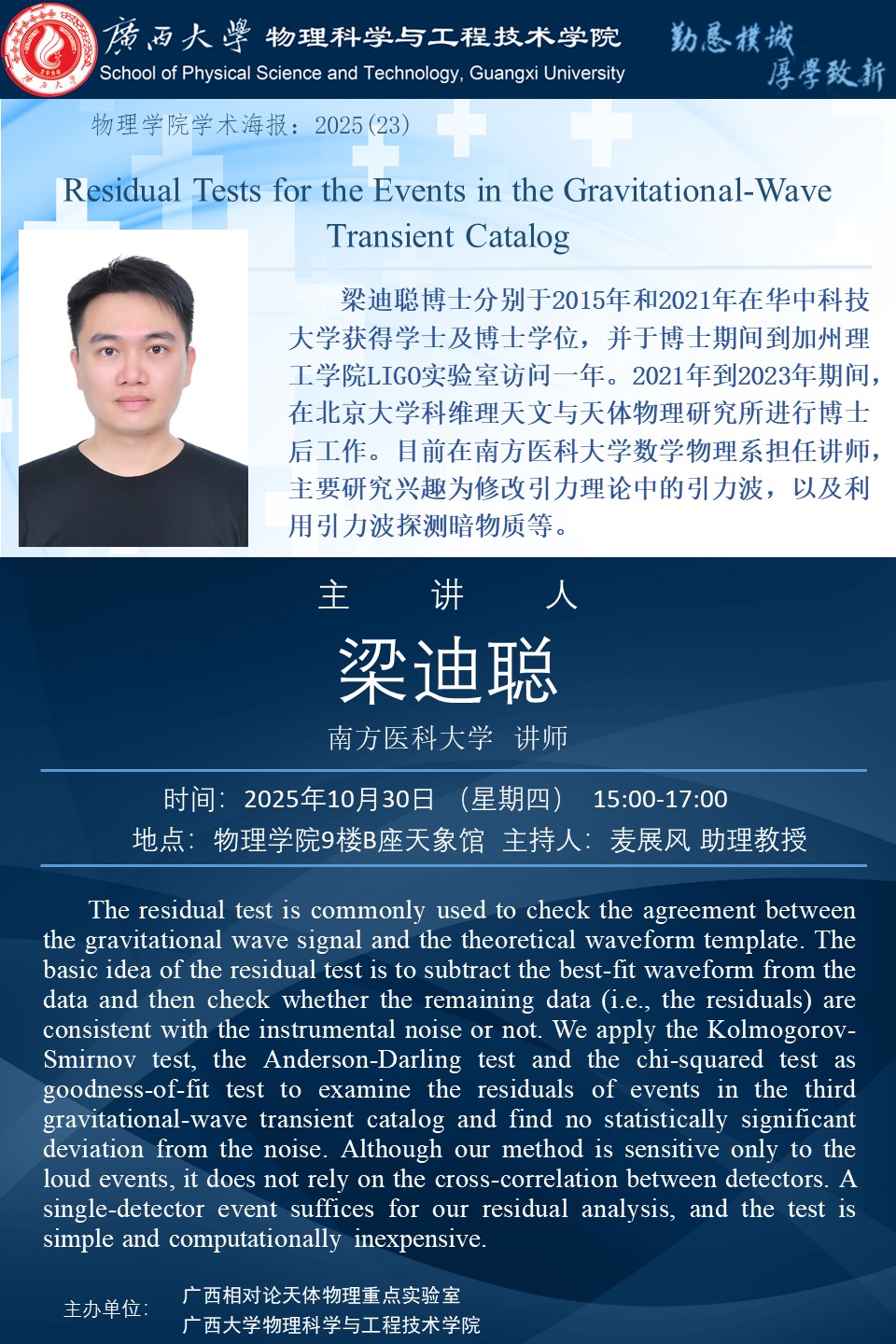 物理科学与工程技术学院学术报告:Residual Tests for the Events in the Gravitational-Wave Transient Catalog